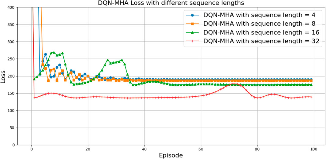 In this section, we examine how the sequence length influences the performance of the DQN-MHA architecture. In this context, the sequence length refers to the number of consecutive time steps provided as input to the self-attention mechanism for the assigned task. As this parameter directly influences how the model integrates past observations (previous knowledge) when estimating Q-values for the current state, it affects both short-term reactivity and long-term planning. The shorter sequences improve efficiency and reactivity over time but may fail in long-term tasks, and longer sequences enhance strategic foresight but require more computation and data.