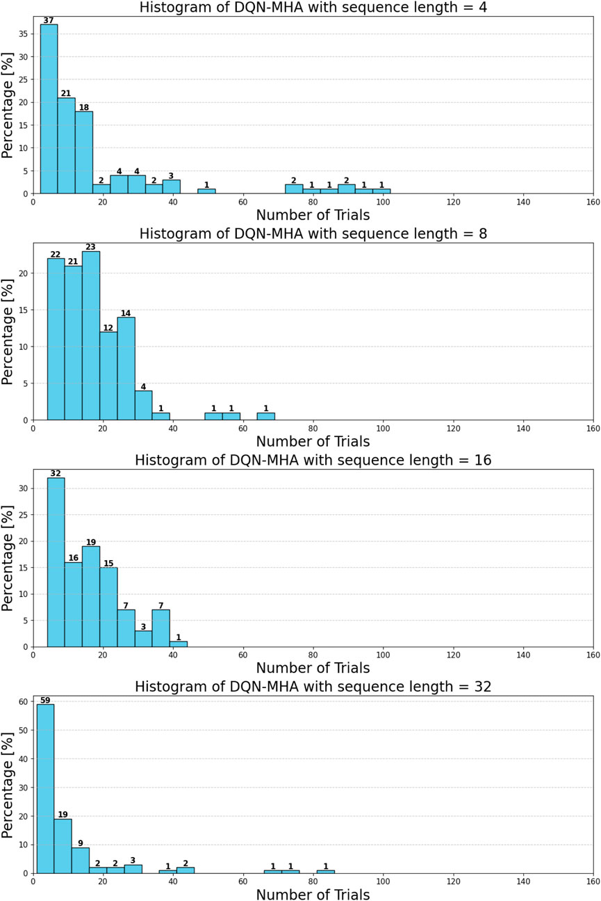 Regarding the TAR and loss curves (see Figures 45, 46), all architectures show similar behavior with a slight improvement observed for DQN-MHA using a 32-time-step window, as shown in Table 16. However, the results in Figure 47 show that increasing the sequence length generally improves the efficiency of the DQN-MHA. When the sequence length increases from 4 to 8, the agent’s average decreases from 17.51 to 16.01 and further to 15.08 with a sequence length of 16, showing gradual gains as more contextual information becomes available to the agent. The largest improvement occurred at 32 steps, where the average decreased sharply to 9.25 trials. This suggests that the assigned task benefits from long context, which helps model the delayed rewards for more consistent planning. Overall, increasing the sequence length in DQN-MHA improves performance, particularly when changing from medium to long context windows. However, this gain comes at the expense of higher computational and memory usage. The DQN-MHA results show no significant differences among shorter windows (TW = 4, 8, and 16), with negligible effects. In contrast, TW = 32 consistently outperforms the others, yielding significant improvements with medium effect sizes, as shown in Table 17.