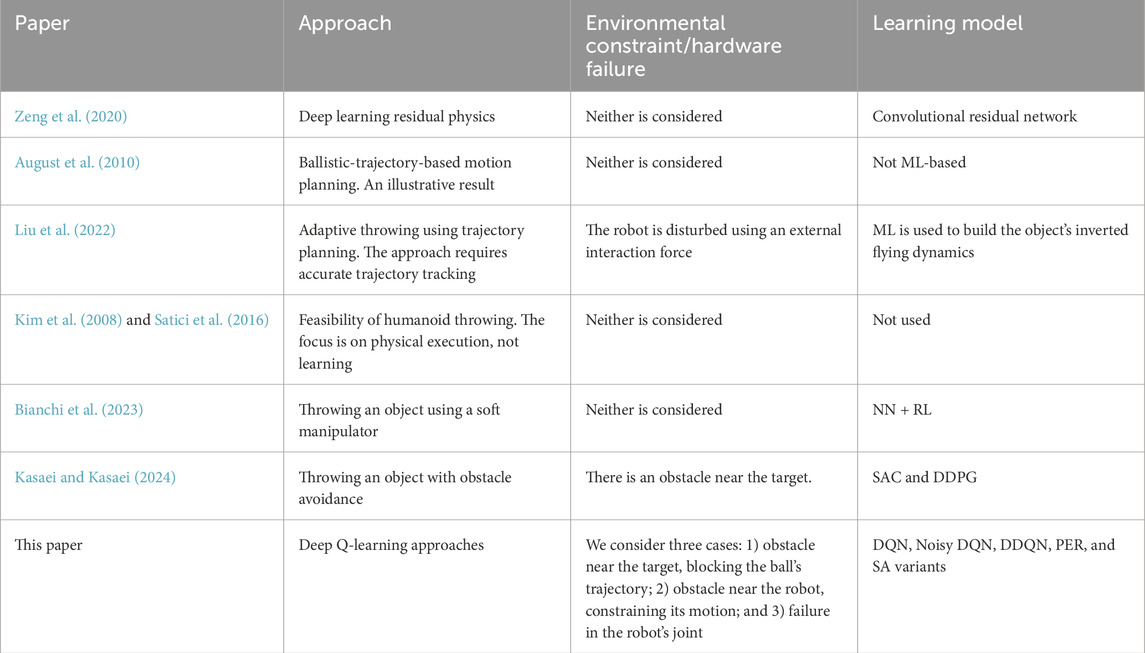 This research further tackles real-world limitations such as hardware faults (e.g., joint restrictions) and environmental obstacles (e.g., nearby walls or target obstacles), demonstrating how these challenges can be effectively addressed through reward shaping within the Q-learning framework. To the best of our knowledge, this is the first study to evaluate the performance of learning algorithms for robotic throwing under such conditions, as summarized in Table 2.