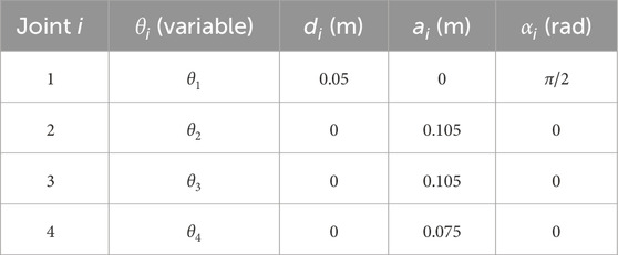1. For the PhantomX Pincher Robot Manipulator (Figure 10, DH parameters provided in Table 3), used in pick-and-place tasks, the defined actions for each joint are as follows: