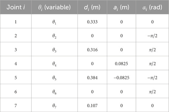 3. For the Franka Emika Panda robot (Figure 5, DH parameters provided in Table 5), also used in the throwing task, the defined actions are as follows: