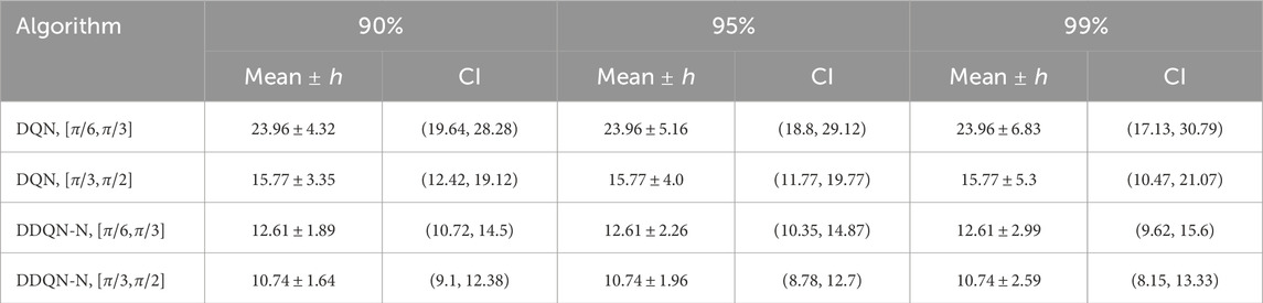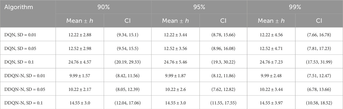 To ensure statistical robustness, all reported results are based on N independent runs with different random seeds. In addition to mean values, we provide 90%, 95%, and 99% confidence intervals (Tables 11–17), including the corresponding half-widths, which quantify the uncertainty associated with each estimate. Reporting confidence intervals across multiple levels offers information equivalent to formal significance testing while avoiding the pitfalls of assuming specific distributional forms, which are often violated in reinforcement learning outcomes. The observed performance differences, therefore, represent statistically meaningful improvements. Furthermore, the magnitude of gains (e.g., DQN-MHA achieving approximately 60% higher mean performance than DQN under comparable conditions) illustrates the practical significance of the results. Our choice of sample size follows established practice in the reinforcement learning literature, balancing computational feasibility with reliable estimation of performance variability.