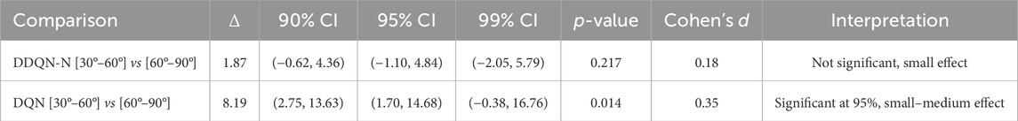 The joint range comparison highlights differing sensitivities between the DDQN-N and DQN algorithms. For DDQN-N, the performance difference between the 30°–60° and 60°–90° ranges is not statistically significant, with a very small effect size, indicating stable behavior across these ranges. In contrast, DQN shows a significant difference at the 95% confidence level, with a small-to-medium effect size, suggesting that its performance is more strongly influenced by joint range variations. These results suggest that DDQN-N demonstrates greater robustness to changes in joint range, while DQN is more susceptible to performance shifts under different configurations, as shown in Table 15.