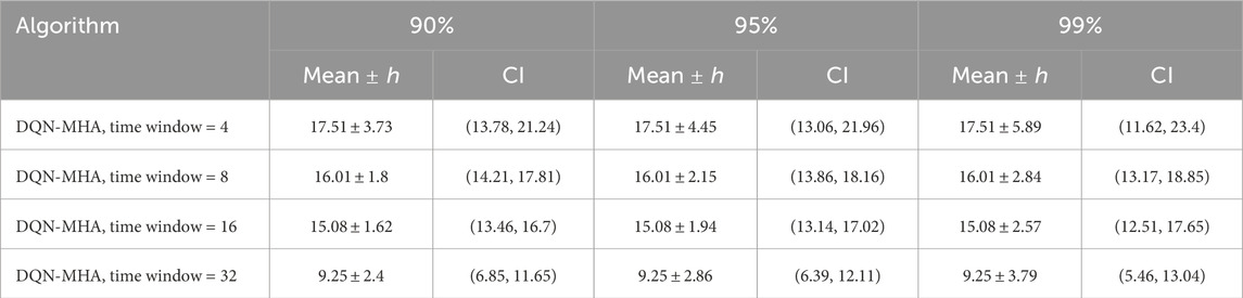 Table 16. Performance with 90%, 95%, and 99% confidence intervals of the number of trials across the DQN-MHA algorithm with different time windows.