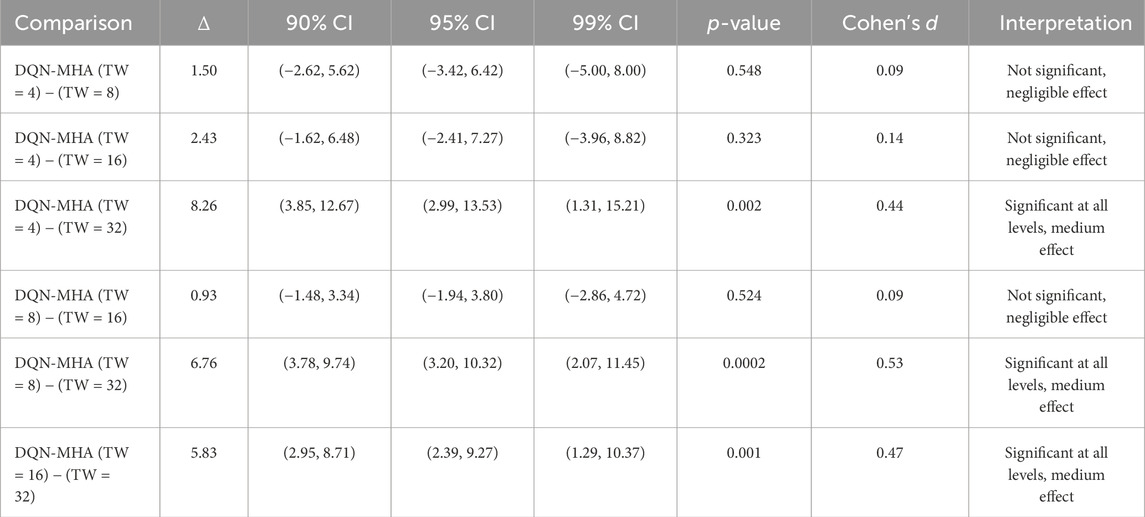 Table 17. Pairwise comparisons of the DQN-MHA algorithm under different time windows (TW = 4, 8, 16, 32). Mean differences