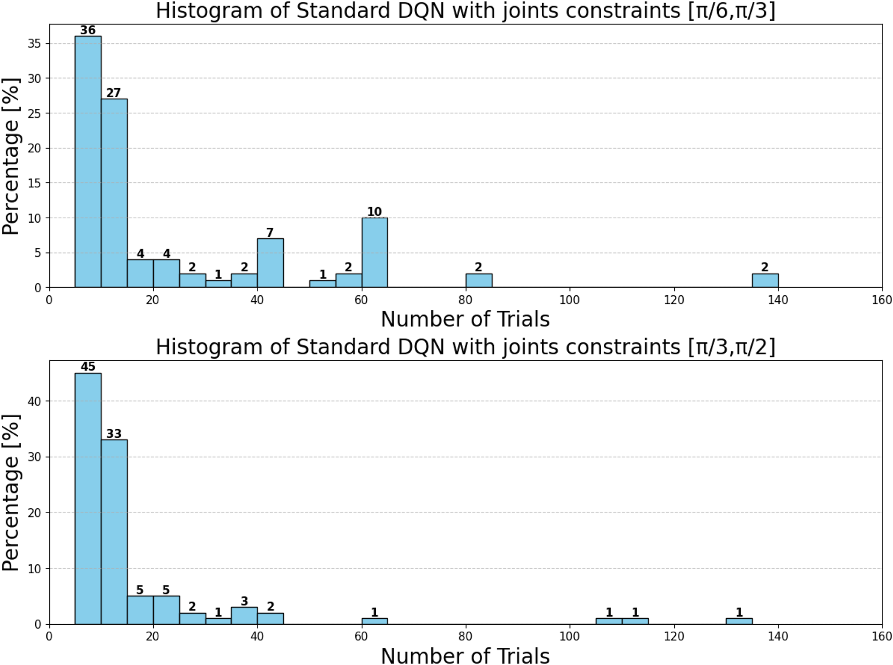 The activities performed by the agent in DRL are called actions. Actions can be discrete, continuous, or a combination of both. Discrete actions represent fixed behaviors, such as moving left or right in a grid, moving up or down, or pressing and releasing buttons. Continuous actions specify variable values related to the agent, such as the angle position of a steering wheel or the angular velocity of robot joints. Some environments require multiple simultaneous actions, like adjusting an angle by a discrete increment while setting a continuous angular speed (Lapan, 2018). In this paper, the actions in DQN or Q-learning are described as varying between experiments. Importantly, the joint positions in all experiments respect the physical constraints and limitations of the robot arm.