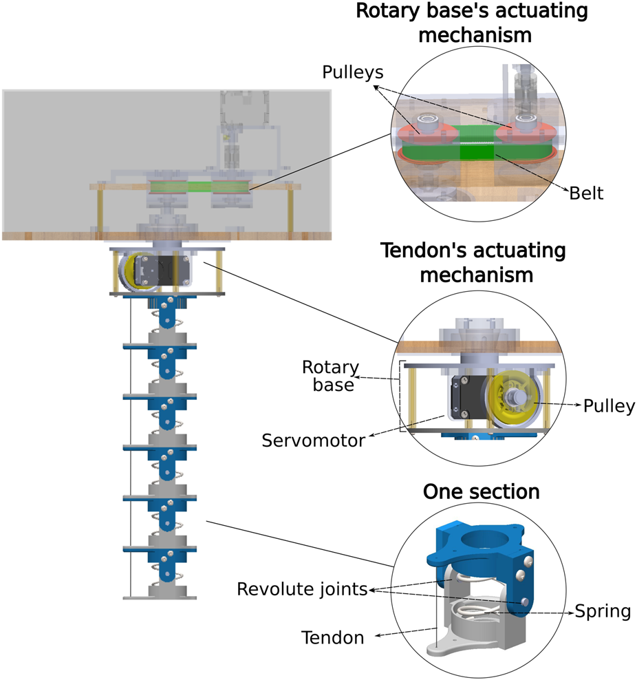 To enable bending in one direction, one tendon path is added to the discs and incorporates a steel cable with a diameter of 0.8 mm parallel to the backbone. The tendon is fixed to the tip and wraps around a pulley attached to a DYNAMIXEL XL-430-W250-T servomotor. An adjustment is made to the initial position of the motor to ensure that the cable is taut from the start. Then, the cable remains taut in any bending position because of the revolute joints that prevent elongation or compression of the backbone. This tendon servomotor is fixed to a rotating plate, which allows the body to rotate 360°, providing an additional degree of freedom to the robot. To enable rotation, another DYNAMIXEL XL-430-W250-T servomotor is coupled to a pulley (30T and 48 T) and GT2 belt system is mainly used for impact absorption and motion transmission. The current design does not support multiple rotations of the rotary base. This is to prevent twisting of the power and data cables that supply the servo motor in the rotary base. Moreover, a 360° rotation covers the entire workspace and there is no requirement for having multiple turns. Yet, if needed in future implementations, the use of a rotating connector can accommodate continuous rotation without causing entanglement.