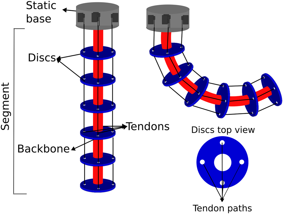 In tendon-driven continuum robotics, typically flexible materials are used as joints and/or the backbone giving them the capacity of enabling complex movements actuated by cables. Depending on factors such as number of cables and cable routing, the robot can bend in one or several directions. Standard TDCRs require at least two tendons for planar bending and three tendons for spatial bending (Rao et al., 2021). TDCRS are, however, susceptible to deformation under external loads or forces affecting their precision. In classical robotics, revolute joints are commonly used where controlled and precise rotational movements are required. Revolute joints allow relative rotation between two parts joined around a fixed axis, restricting motion to a single degree of freedom, meaning that the body can rotate but cannot translate in other directions.