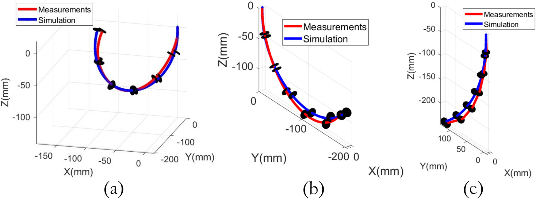To validate the constant curvature model, measurements were obtained on the real HTDCR with a motion capture system (Qualisys 6 Miqus cameras and 14 reflective markers placed along the body). We compared the measurements to simulations of the forward kinematic model (last column of in Equation 3). Figure 4 shows three examples of spatial bending for the simulations and HTDCR measurements. The error at the tip was computed for 14 different bending positions where each position was repeated 3 times. The errors range from 6mm to 24 mm which is in agreement with errors reported in other studies for open-loop control based on constant-curvature models (Qi et al., 2024; Amanov et al., 2021). Although out of the scope of the paper, it is worth noting that the precision could be improved by using closed-loop control as in (Qi et al., 2024).