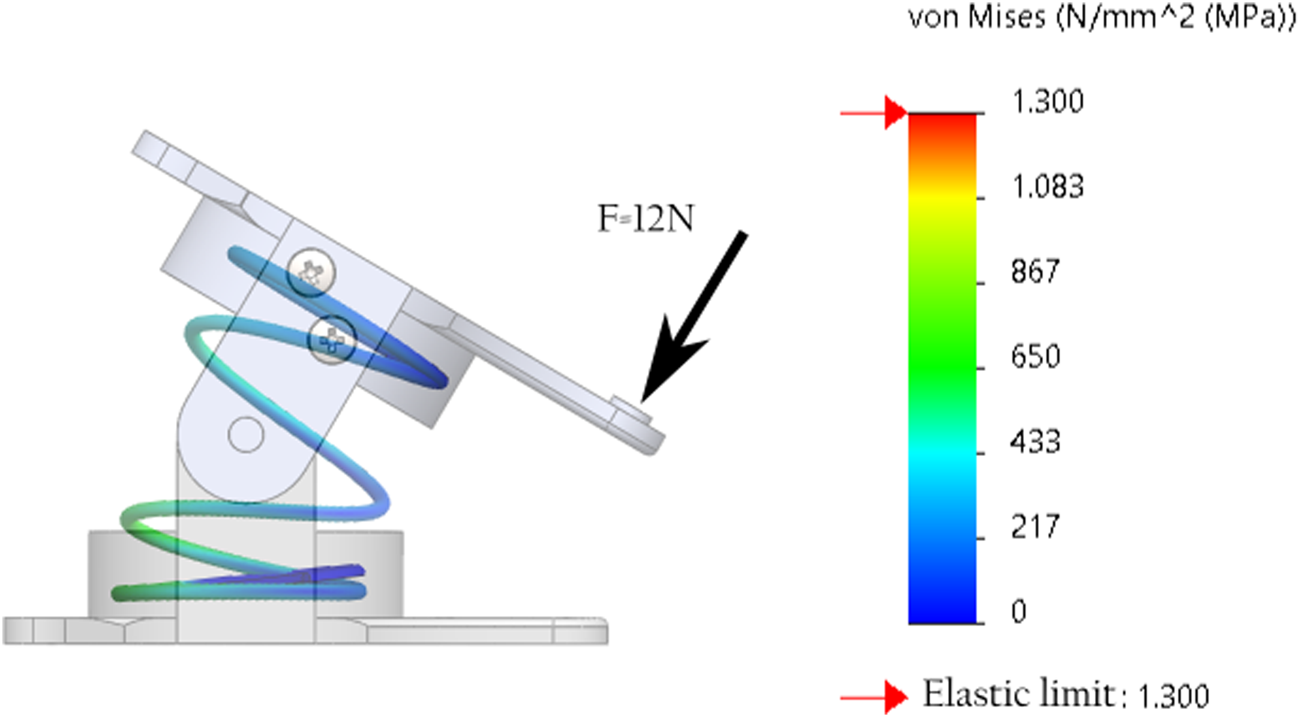 A prerequisite to experiments under load is to characterize the maximum load the HTDCR can support. The force required to induce maximum bending of the body without load is estimated to . This estimation was obtained from SolidWorks simulations of large displacements Finite Element Method (FEM) for one individual section of the arm, focusing on the spring under bending loads. Figure 5 shows the stress of one section of the arm with a actuation force. We can see that the stress supported by the spring ranges from to which is well below the elastic limit of for the steel material (EN 10270–1) of the spring.