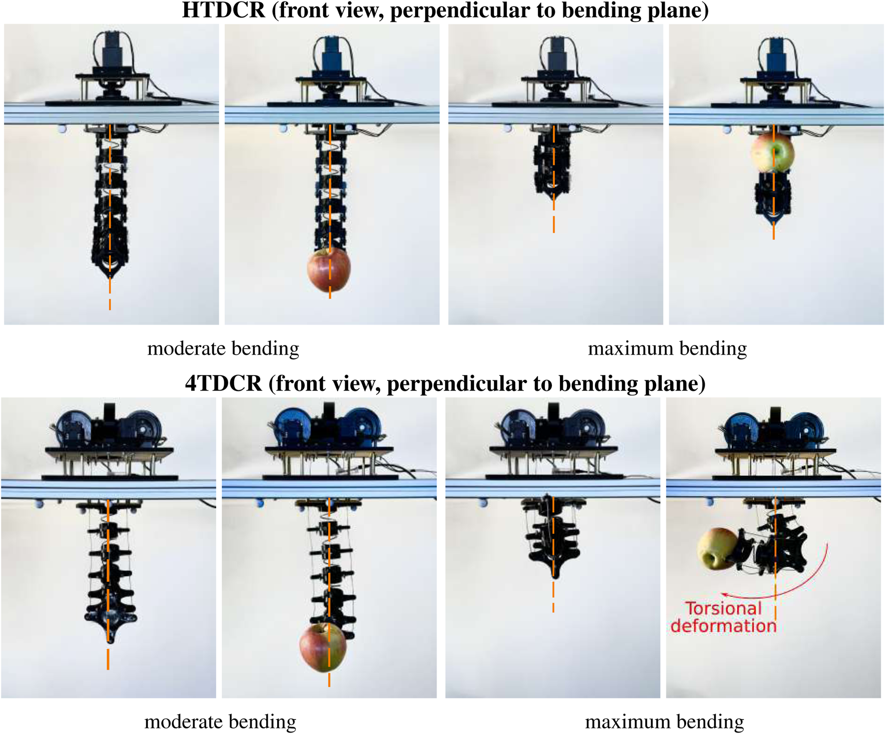 Illustrative example of torsional deformation Frontview comparison of the HTDCR and 4TDCR prototypes with and without a 186 g apple at the tip. Two bendings were considered (moderate and maximum).
