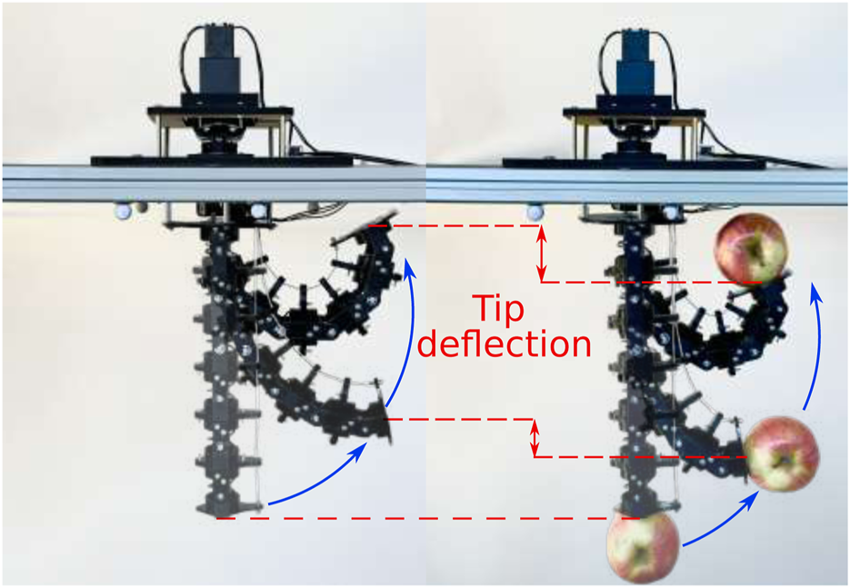 Agriculture is an emerging field for TDCRs, holding great potential for navigating through crop fields without causing damage to the plants (Armanini et al., 2024). However, TDCRs flexibility, also implies lower stiffness materials, which can pose challenges in achieving precise positioning under load or in responding to external forces without deformations. This limitation can be particularly problematic for harvesting where, despite the relatively low weight of common fruits (on average, 150 g for peaches, 120 g for pears, and 200 g for apples), external forces can still induce undesired bending or twisting that disrupts the robot’s accuracy. As a result, achieving consistent and controlled interaction with the environment may require compensatory mechanisms, such as advanced feedback systems or structural reinforcements, to mitigate these unintended movements and improve handling precision.