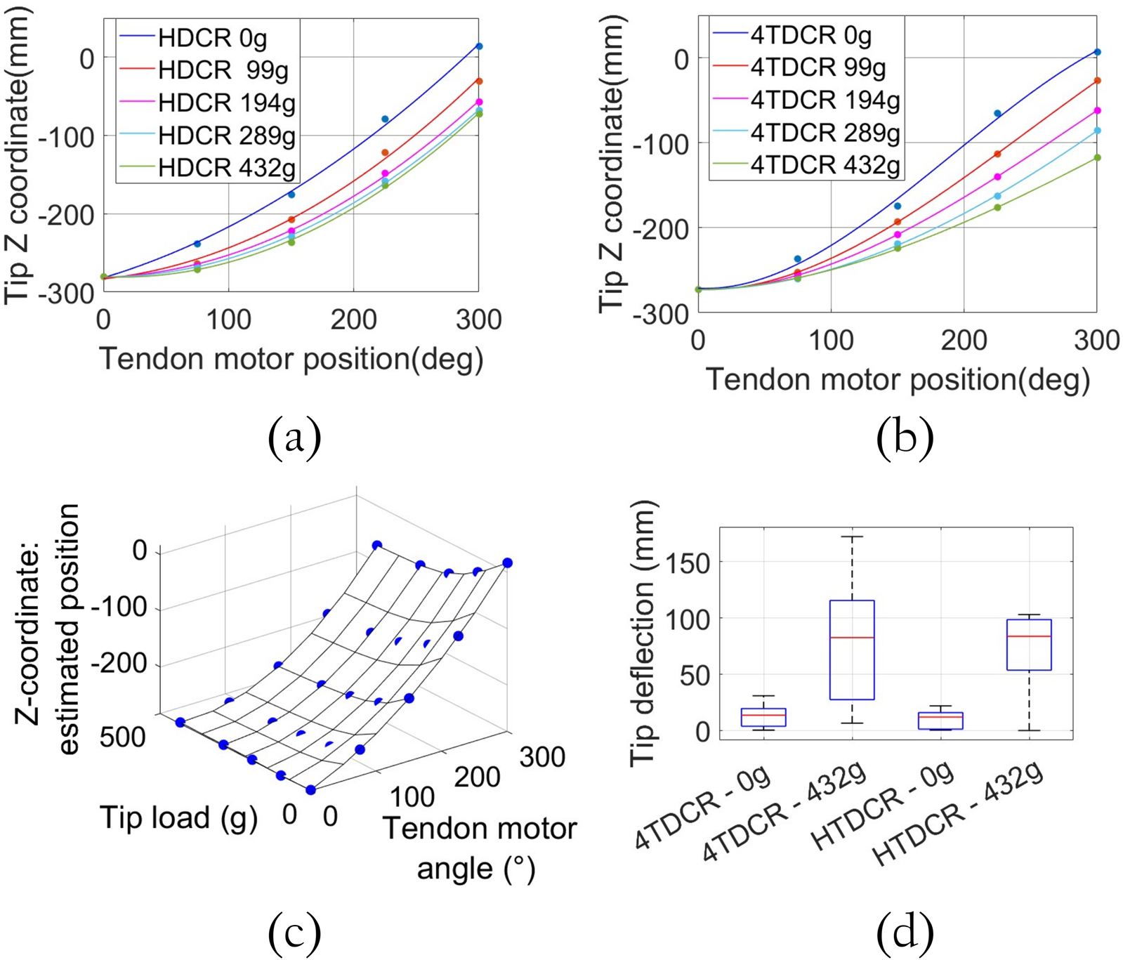 Tip deflection analysis with diffent loads and bending positions. Tip deflection for HTDCR (a) vs. 4TDCR (b) Tip deflection is measured from initial to maximum tendon motor position as the -coordinate of the tip when applying different loads. (c) HTDCR tip deflection vs. tip load and bending angle. A polynomial of degree 3 was fitted on the tendon mtoor angles and another of degree 4 on the tip loads. Altogether, it constitutes a 25 data (5 loads applied to the tip and 5 positions of the arm). Pearson correlation , RMSE = 0.97 mm. (d) Distribution of the tip deflection in the bending plane of both prototypes with and without maximum tip load.