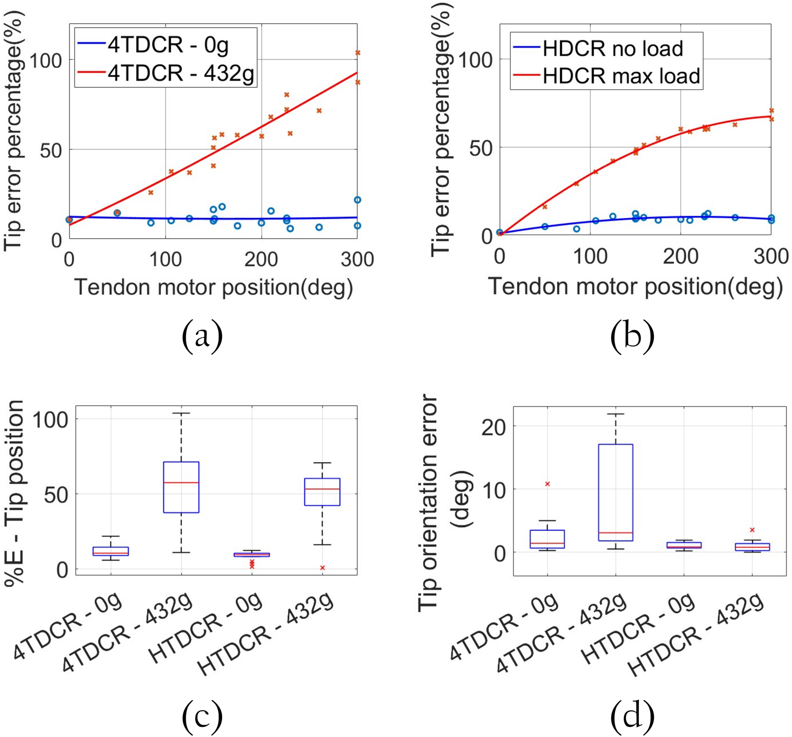 Comparison of the tip position and tip orientation error percentage for the 4TDCR and the HTDCR without load (blue data) and with maximum tip load (red data). (a) 4TDCR calculated tip position error percentage. (b) HTDCR calculated tip position error percentage. (c) Distribution of the tip position error percentage for both prototypes. (d) Distribution of the tip orientation error for both prototypes with and without maximum load .