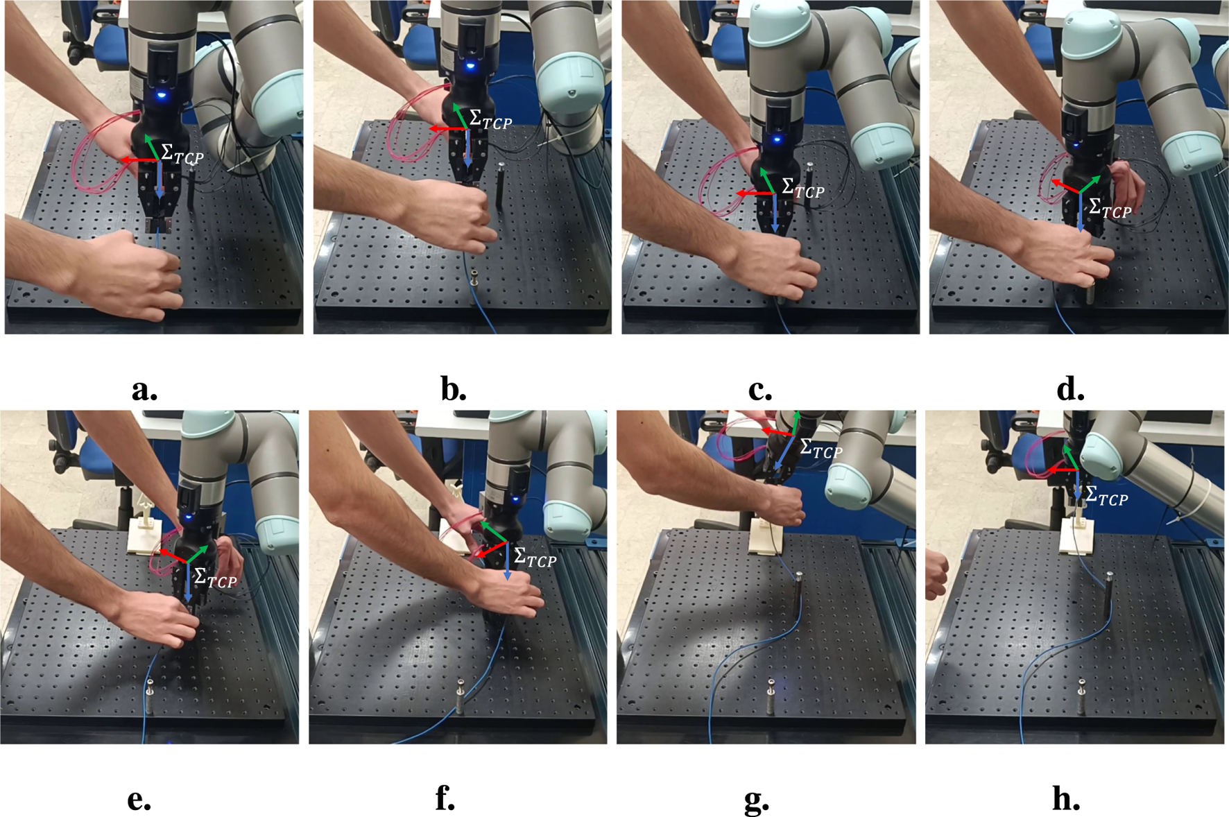 The whole routing task has been executed as described in the following. At the beginning no trajectory is saved into the database, so the robot is set in hand-guidance mode. Hence, the operator guides the robot through the desired path by exerting forces or torques on the wire grasped by the modular sensors. Figure 8 shows the value of the indicators and the corresponding velocities during the whole experiment, which can be divided into six intervals. From the starting point (Figure 9a), the robot is moved in the -direction (time interval s, see Figure 9b), then it is translated in the -direction (interval s, see Figure 9c). Next, the frame is rotated about the -axis (interval s, see Figure 9d), then a translation in the -direction is applied (interval s, see Figure 9e), and the frame is rotated about in the opposite direction (interval s, see Figure 9f). Finally, the robot is positioned above the clip applying simultaneous rotations about the and the -axes, and a translation in the -direction (see Figure 9g). Finally, the robot inserts the wire into the clip (see Figure 9h). After the teaching phase, the robot autonomously executes the wire routing task. In this phase, possible wire entanglements are evaluated by comparing the indicator with a fixed threshold equal to mm. Figure 10 reports the indicator during the autonomous wire routing. While executing the task, an entanglement is simulated on purpose at the instant s, and the robot consequently stops. Then, the operator frees the wire and the routing operation is resumed. The threshold can be decreased or increased to have more or less sensitivity, respectively. The video attached to the paper shows the described experiment in detail.