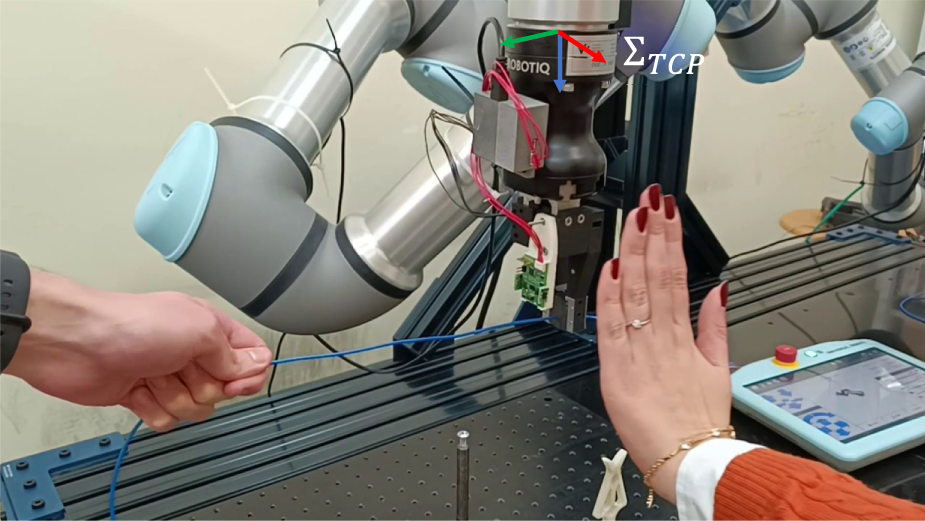 Hand guidance and obstacle avoidance. An operator guides the robot by pulling the grasped wire while another operator simulates an obstacle nearby the end effector. The robot reacts by following the operator guidance but moving far from the obstacle.
