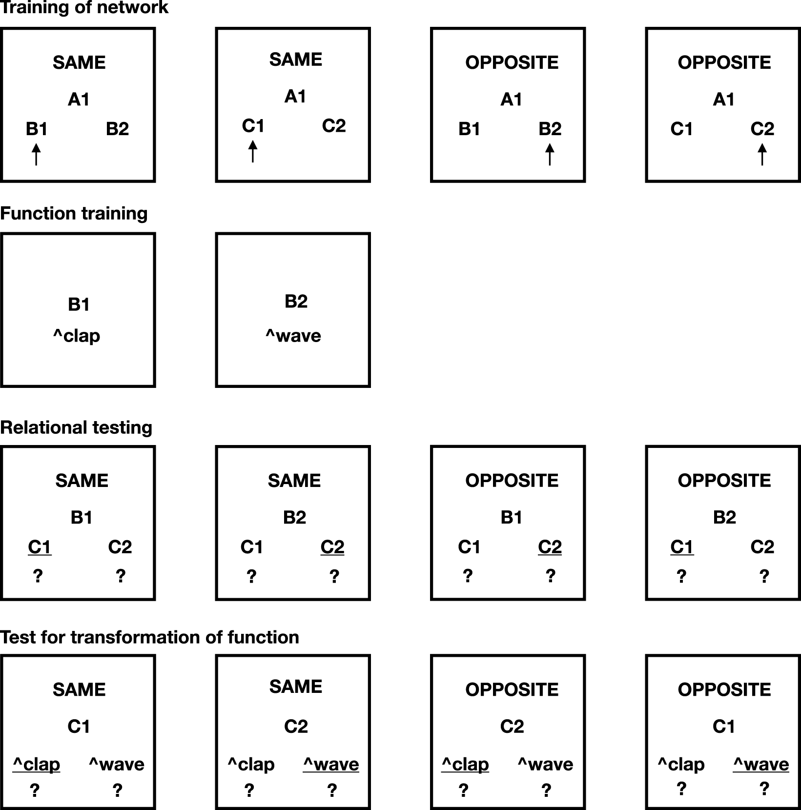 We validate our approach with two experimental paradigms inspired by human studies. The first is a stimulus equivalence task involving three groups of stimuli and tests for derived symmetric and transitive relations, as well as a demonstration of the transformation of stimulus function (e.g., if one stimulus in a set is given a certain meaning or consequence, the others derived to be equivalent to it also reflect that meaning) (Hayes et al., 1987). The second is an oppositional relational network task, where the system learns a network of “opposite” relations (a case of a more complex relational frame) and we examine how this leads to emergent relations and transformations of function consistent with what is observed in human experiments on relational framing of opposites (Roche et al., 2000).