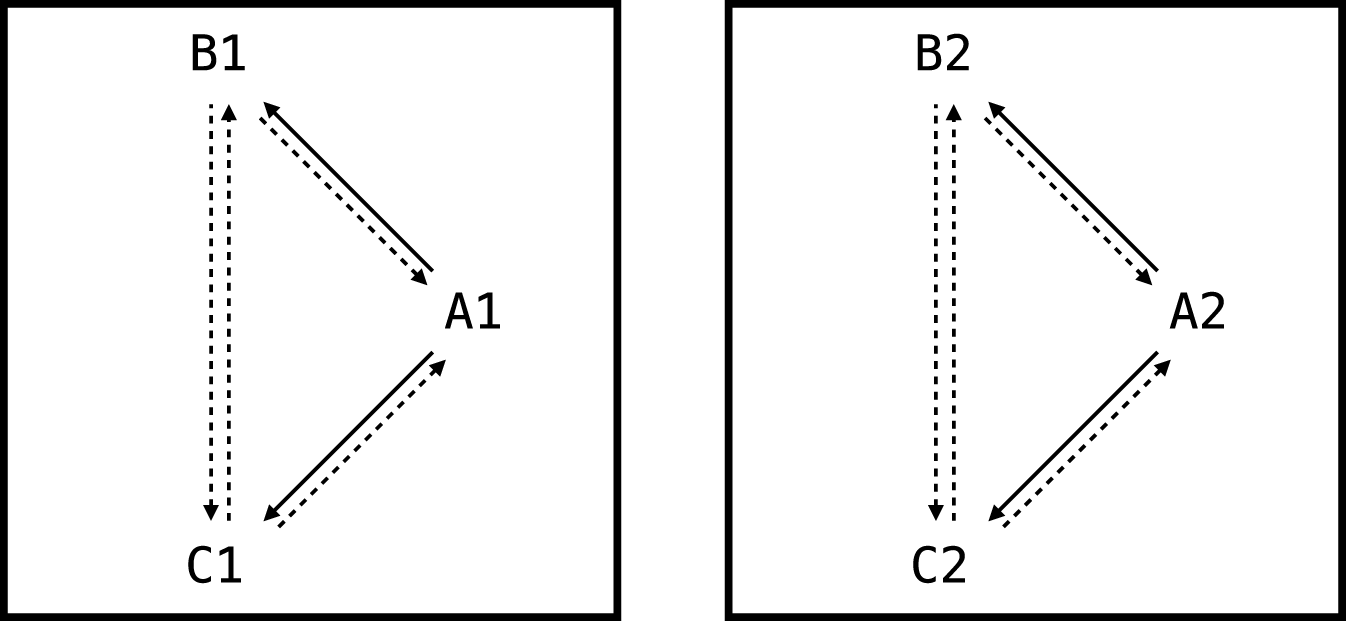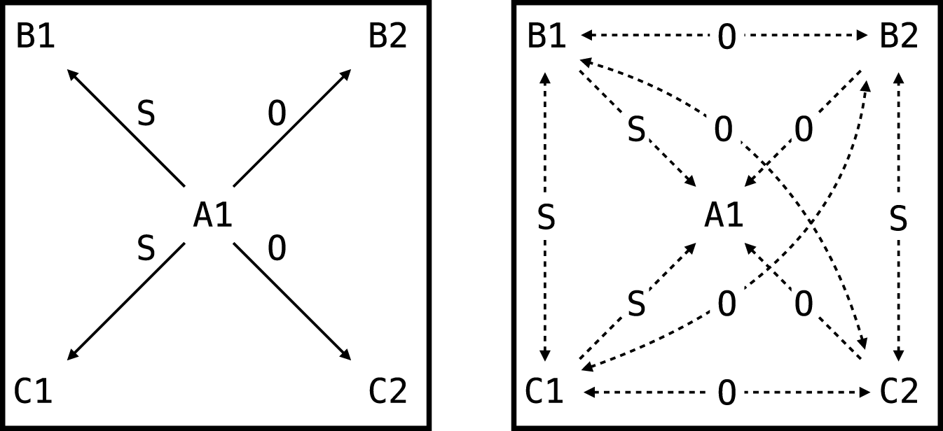 Mutual Entailment: This is the bidirectionality of derived relations. If a person learns a relation in one direction (e.g., A is larger than B), they can derive the relation in the opposite direction (B is smaller than A) without direct training (Luciano et al., 2007). In classical terms, mutual entailment encompasses symmetric relations (if , then ) and the inverses of asymmetrical relations (if , then ) in a generalized way. Notably, the derived relation might not be identical in form (for instance, larger than vs smaller than are inverse relations rather than exactly the same), but they are mutually implied by each other given the contextual cues (such as the contextual cue for comparison).