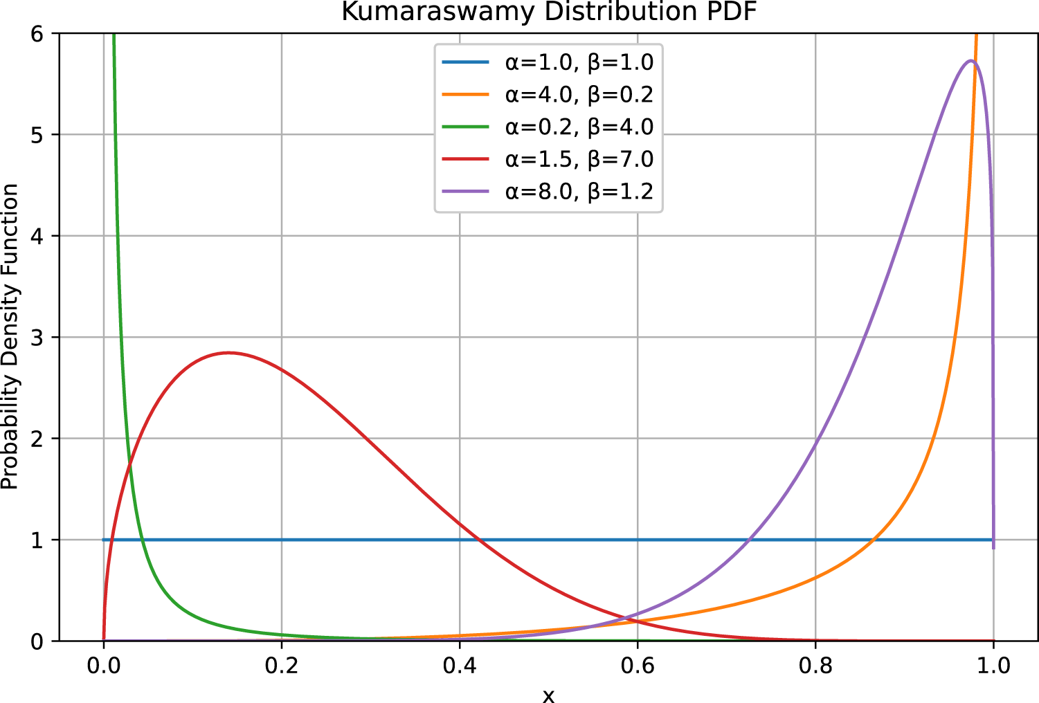 Mathematically, the PDF function of the Kumaraswamy distribution can be expressed by the following Equation 1: