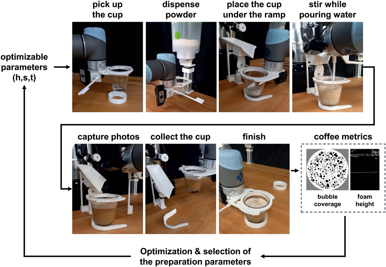 Robot Food Scientist. The robot setup with integrated computer vision is used to optimize the parameters of the beverage preparation, and to simulate human behavior in response to detection of undissolved powder clumps.