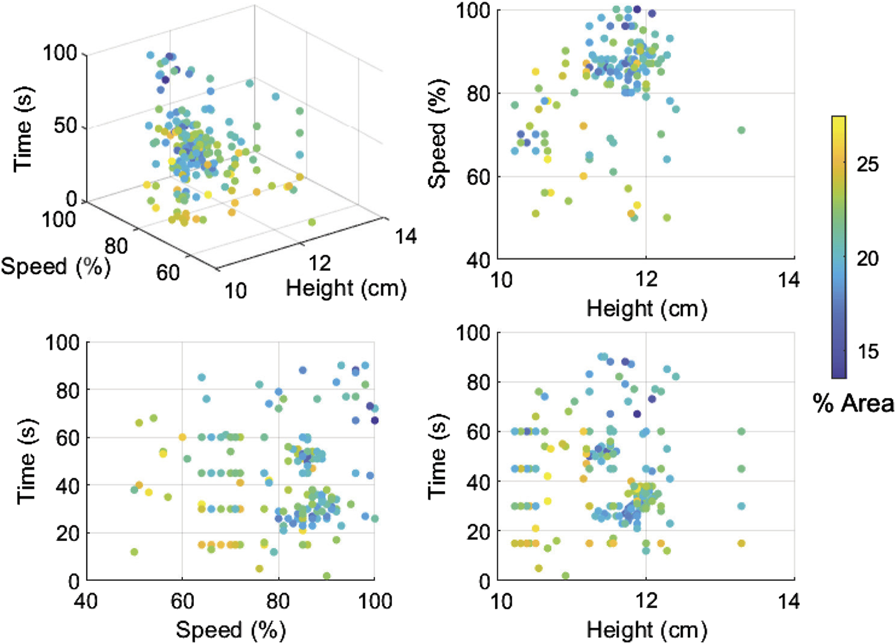 Before performing BO, approximately 100 coffees were made using the experimental setup. This included a mix of grid-based and random exploration to investigate the design space and the observed variability. The bubble area of these coffees as a function of the mixing speed, time and pour height is shown in Figure 8. The results demonstrate the complexity of the interactions. It is evident that for the stirring speed lower than 60%–70% and mixing time below 20 s the coffee quality distinctly drops, resulting in high bubble coverage. With respect to the water pouring height, it is hard to indicate a clear trend–it may be due to the too narrow height range or low bubble area dependence on this parameter. Low pouring height and quick mixing at high speeds results in some instances of lowest bubble coverage. However, other combinations of parameters also produce high quality coffees. This further supports the use of BO, as there is no single local minimum that can be found with simple gradient descent-based methods.