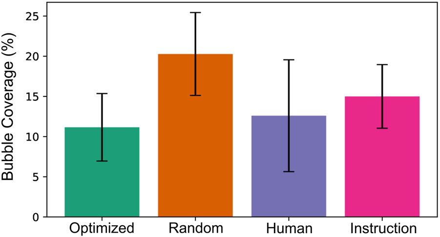 As BO provides no guarantee of optimality, the optimal processing conditions found were compared to others: 1) random selection of mixing conditions, 2) coffee preparation by a human, 3) robot following the provided producer’s instructions. For each of these cases, four coffees were made with the results presented in Figure 11, proving that BO-defined conditions outperformed the others. Although the human-made coffees had on average only one percentage point more bubble coverage compared to BO, they showed higher variance. Given that the human can use continuous visual feedback to adaptively mix the coffee, this highlights the quality of the optimal performance found using BO. The random preparation parameters presented the worst performance, and the instruction-based performance was inferior to the one of a human.