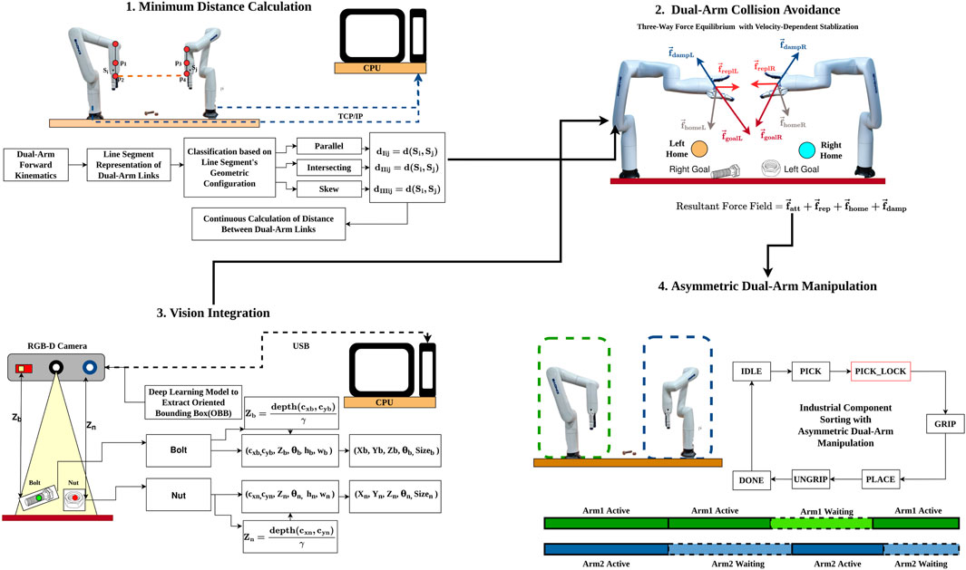 In this paper, we presented a comprehensive framework for dual-arm asymmetric manipulation with inter-arm collision avoidance for handling industrial components. Our approach introduces a computationally efficient collision detection method that represents manipulator links as line segments in 3-D space, enabling real-time distance monitoring through analytical solutions for parallel, intersecting, and skew configurations. The integration of YOLOv8 OBB-based object detection achieves robust real-time perception at 20 frames per second with oriented bounding boxes, demonstrating high accuracy of 0.99 and 0.97 for bolt and nut detection respectively along with components size estimation. The improved Artificial Potential Field (iAPF) framework implements a novel three-way force equilibrium through exponential attractive, inverse-square repulsive, and exponential home-seeking forces, significantly enhancing trajectory stability and reducing oscillations compared to traditional APF approaches. Our hybrid twist control scheme combines iAPF-generated linear velocities with PD-controlled angular velocities, with proven stability through Lyapunov analysis and enabling precise asymmetric manipulation through a priority-based state machine. Experimental validation demonstrates the framework’s effectiveness in handling challenging scenarios, including close-proximity object sorting and goal conflicts between manipulators, while maintaining safe separation distances. This integrated approach provides a promising foundation for deploying collaborative dual-arm systems in industrial settings where reliable, efficient, and safe manipulation of industrial components is essential. The proposed framework assumes a controlled workspace free from external dynamic obstacles, focusing primarily on inter-arm collision avoidance. The vision system is currently limited to pre-trained component classes (nuts/bolts), though it remains adaptable through retraining for new object types.