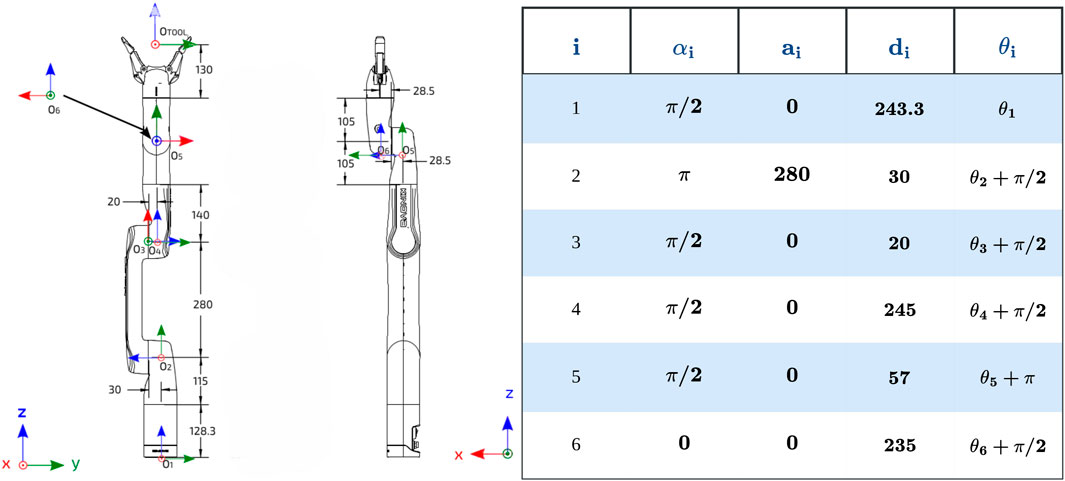 Technical drawing of a robotic arm with six rotational joints labeled O1 to O6. Each joint axis shows X, Y, Z axis indicators. Dimensions between joints are in millimeters. Next to the drawing, a table lists modified DH parameters for each joint, including \( \alpha_i \), \( a_i \), \(d_i \), and \( \theta_i \). Values differ for each i, ranging from 1 to 6.