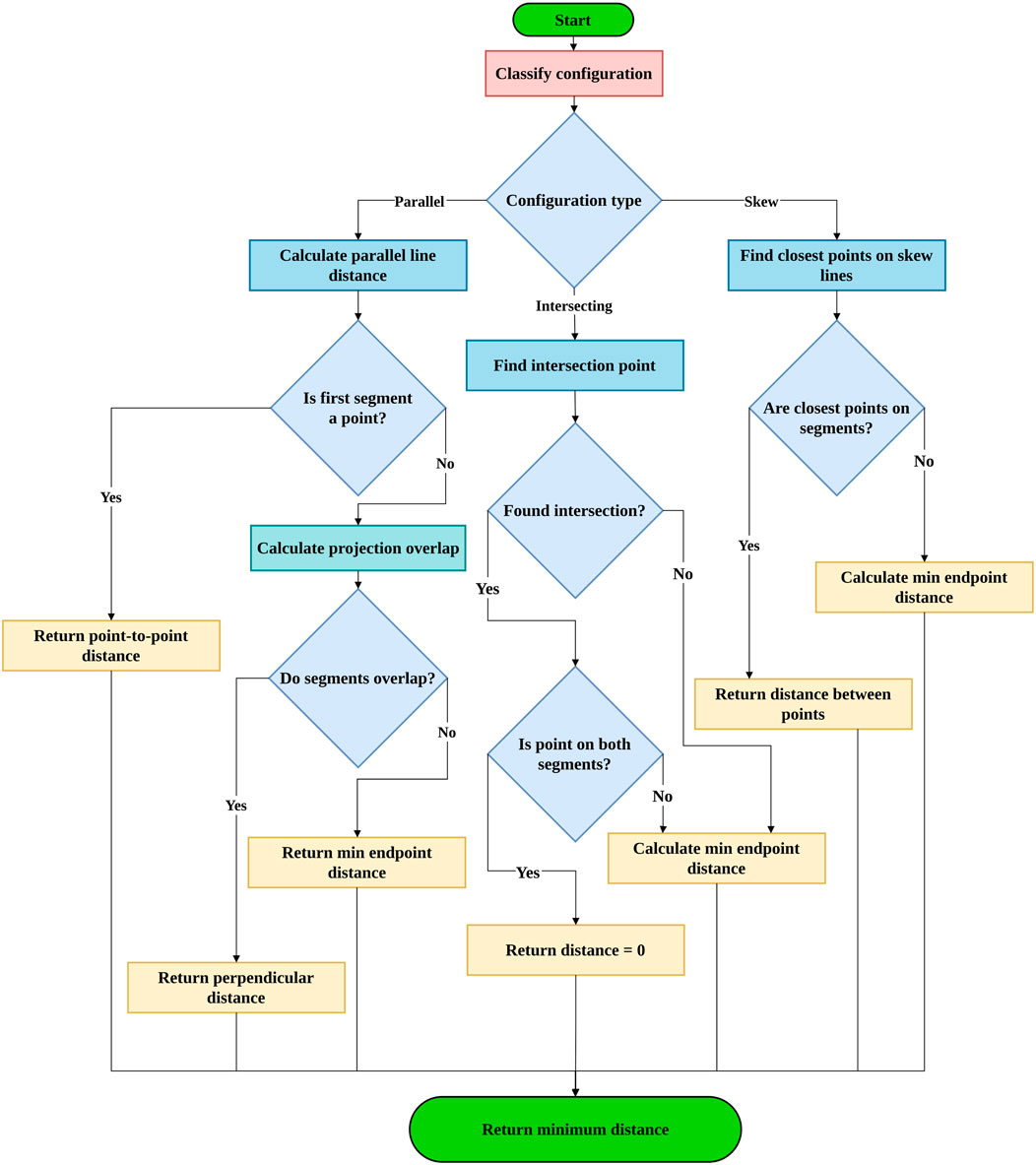 1. Case-Specific Analytical Inter-Arm Distance - Algorithm employing closed-form vector solutions for parallel, intersecting, and skew link configurations with epsilon-based numerical stability handling.