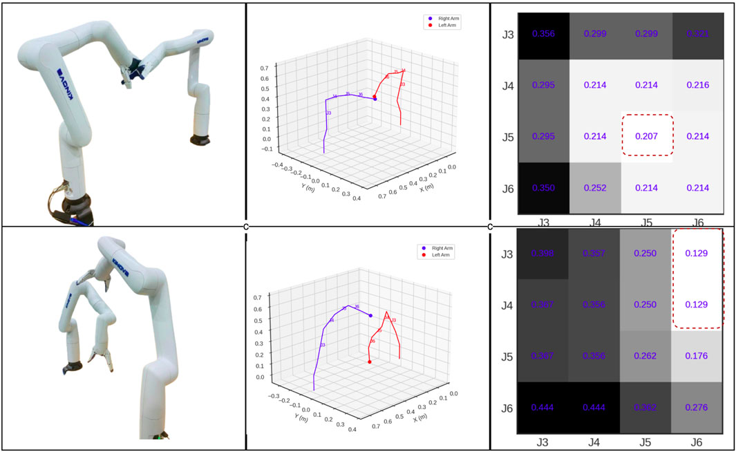 Image showing two different scenarios of two robotic arms with their corresponding links in 3D plots and their inter-arm distance in heatmaps. The top row displays arms in an extended pose, with their links indicating their configuration in 3-D for right and left arms. The bottom row shows arms in a closer configuration. The heatmaps present numerical values relating to inter-arm distance data for each corresponding scenario, with darker regions indicating closer proximity between arm segments.