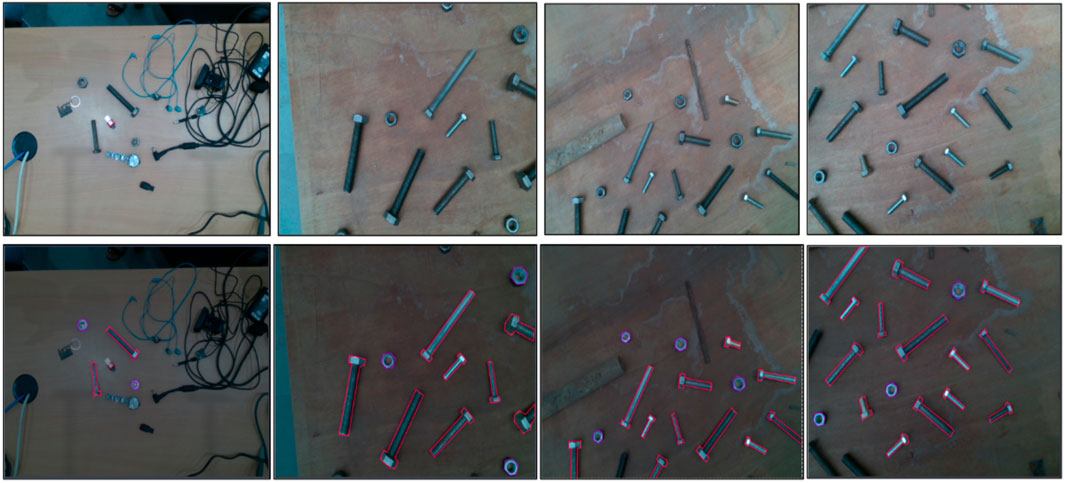 Top row images show various bolts, nuts, and cables scattered on a wooden table. Bottom row images depict the same scenes with red outlines highlighting certain objects, possibly for identification or categorization purposes.