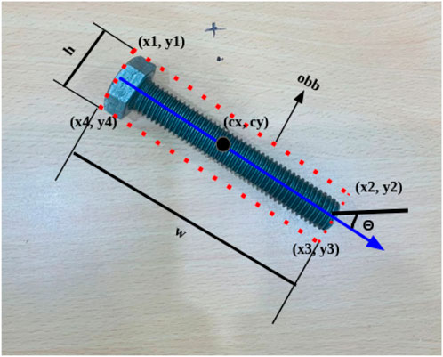 After detecting objects (nuts and bolts) globally from an RGB-D camera, further inferred object centroids (cx, cy) and yaw (θ) along with dimensions of bounding box (h, w) using YOLOv8 OBB inference, as illustrated in Figure 6. Furthermore, this information is transformed into real-world coordinates from the image coordinates using projective transformations using camera intrinsic properties (fx, fy, Cx, Cy) shown below. Considering an object detected in the globally fixed camera frame, using predictions from our model is as shown in Equation 7.
