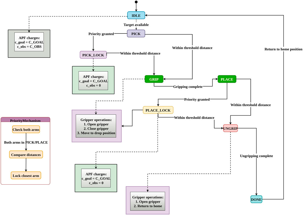 5. Priority-Based Dual-Arm Task Allocation - Hierarchical state machine with comparative-distance-based resource locking for deadlock-free simultaneous manipulation in shared workspaces.