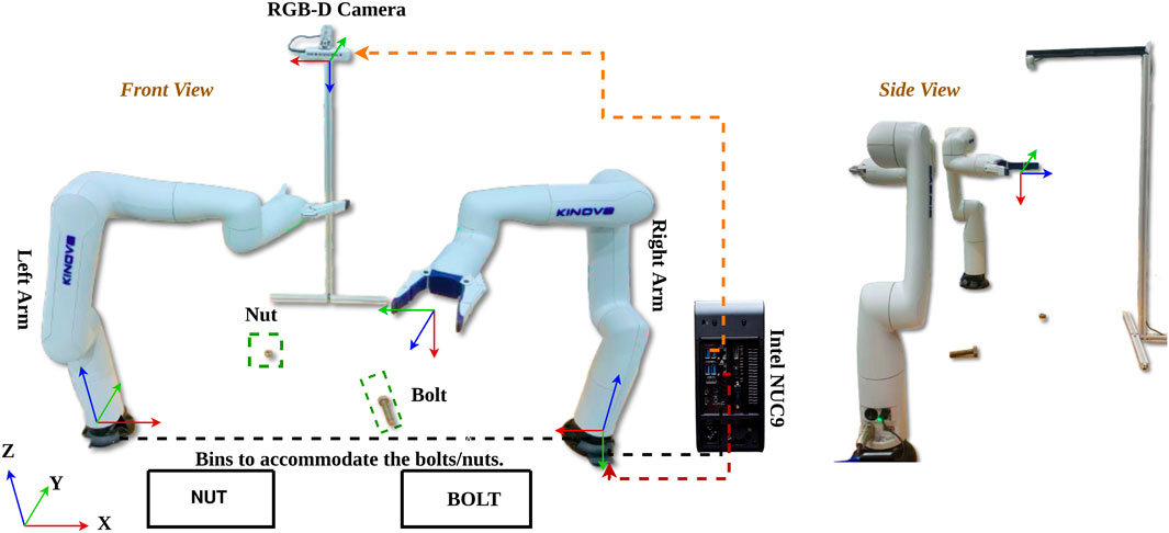 The increasing demand for industrial automation is driven by the need to enhance production speed, accuracy, and efficiency. Robots are increasingly replacing human workers to address challenges like fatigue and maintain consistent performance over extended periods (Liu et al., 2022). Despite challenges with human workers, bi-manual operations offer significant value through component recognition and manipulation. Humans instinctively understand unfamiliar objects by material, shape, size, and color, enabling effective planning for separation or assembly tasks. Integrating these capabilities into robotics is crucial for upgrading industrial automation through: i) HRC - Human robot collaboration where humans and robots collaboratively enhance process efficiency ii) robots with capabilities that mimic human intelligence and dexterity. A dual-arm system with efficient inter-arm collision avoidance and vision perception provides a robust solution matching human-like manipulations, essential for industrial component handling in warehouse management, assembly lines, and manufacturing.