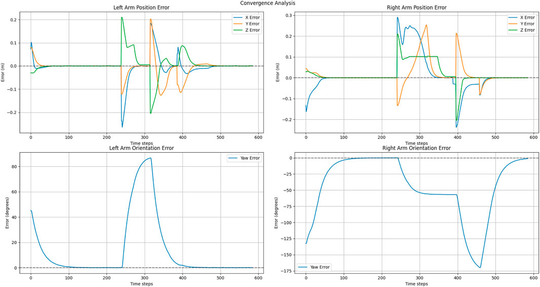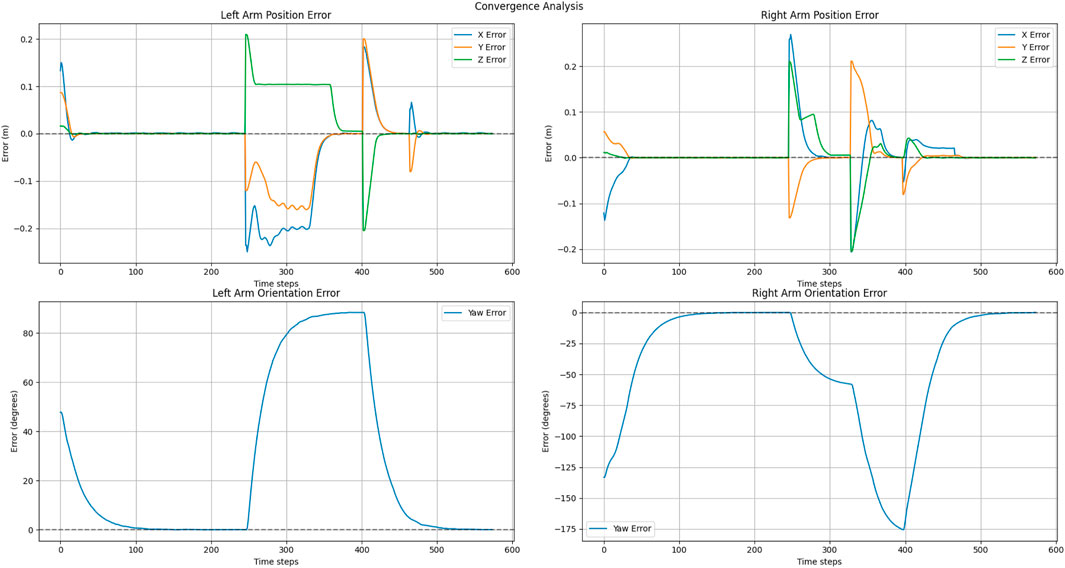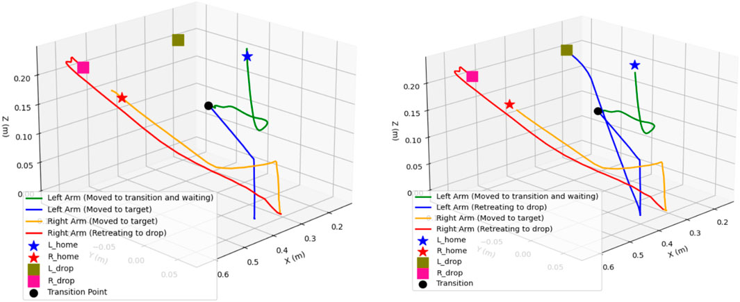 Beyond spatial collision avoidance, successful dual-arm manipulation demands sophisticated temporal coordination to synchronize movements and optimize task execution. Researchers have developed various frameworks to address this critical dimension of collaborative robotic systems. Montaño and Suárez (2016) proposed a temporal coordination approach for multiple robots using Discretized Coordination Space (DCS) where robots adjust timing along fixed paths. It builds a Collision-free Coordination Curve using state diagrams with wall-follower or impact heuristics to select motion directions. The computational complexity increases exponentially with robot numbers (3n1 motion directions), lack of flexibility for dynamic environments since paths cannot be modified, and frequent robot idle periods when coordination points cannot be generated quickly enough, reducing system efficiency compared to reactive approaches like iAPF. Malvido Fresnillo et al. (2023) developed an automatic tool change system integrated with MoveIt’s scene management, allowing robots to exchange end effectors by manipulating collision objects and communicating with hardware interfaces. For dual-arm coordination, they created synchronization methods that merge individual arm trajectories using various timing policies, enabling coordinated manipulation through time-adjusted motion plans or master-slave relationships. However, this planning-based approach has inherent limitations, it requires complete environment knowledge beforehand, and it lacks the reactivity needed for dynamic obstacle avoidance or real-time adaptation to changing conditions. Shin and Bien (1989) presented a collision-free trajectory planning approach for two robotic arms sharing a workspace by transforming obstacles into a virtual coordination space (VCS). Their method allows links of one robot to grow while shrinking the other to a point, visualizing all collision-free coordinations as curves in the VCS. Although innovative for dual-arm coordination, their approach requires explicit modeling of virtual obstacles and lacks the dynamic adaptability of our three-way force equilibrium system that maintains optimal arm configurations throughout the workspace. Basile et al. (2012) proposed a task-oriented motion planning framework that enables programming at the workpiece level through a cooperative planner handling task-space trajectories and kinematic transformations, while separate arm planners compute inverse kinematics for each robot. Despite efficient coordination through their taxonomy-based approach (distinguishing positioners and workers) and extended programming language with high-level instructions, their method suffers from limited real-time adaptability, as it requires complete task specification beforehand and cannot dynamically respond to unexpected obstacles or environmental changes, unlike our iAPF method, which continuously recalculates forces to generate reactive behaviors that smoothly adapt to changing conditions without extensive reprogramming.