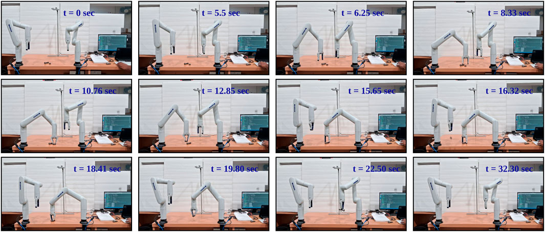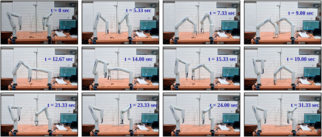 Twelve-panel sequence showing two robotic arms on a table, performing coordinated movements over time, alongside a monitor and documents. Each panel is labeled with a time in seconds, ranging from zero to thirty-one point thirty-three seconds.