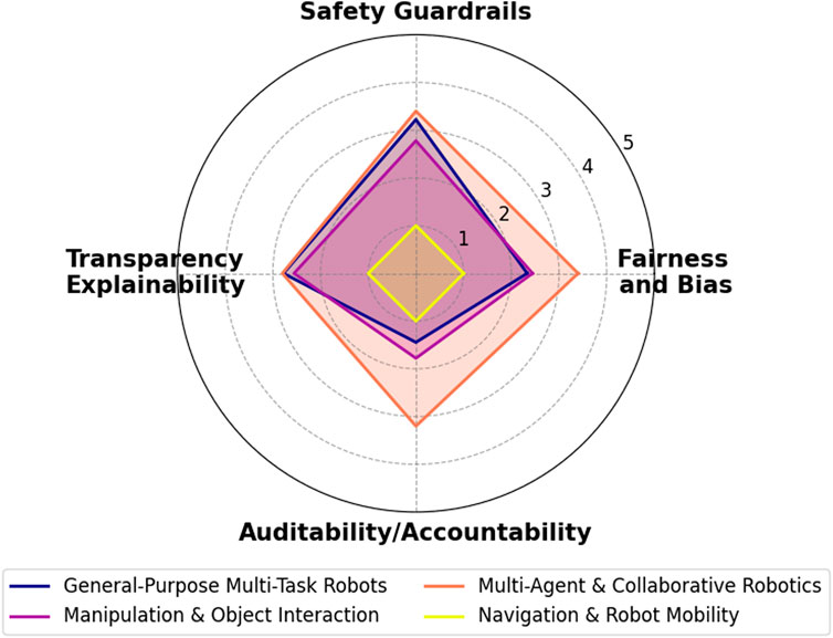 Manipulation and Object Interaction robots consistently emphasize technical safety and robustness, effectively integrating multimodal grounding or affordance-based filtering to limit unsafe actions. Techniques such as those employed by MOO and SayCan strongly illustrate this trend, resulting in comparatively high safety scores. However, the manipulation domain remains weak in fairness, transparency, and governance; few systems explicitly address demographic biases, and transparency usually depends on the specific approach (e.g., code-based outputs like ProgPrompt offer better interpretability).