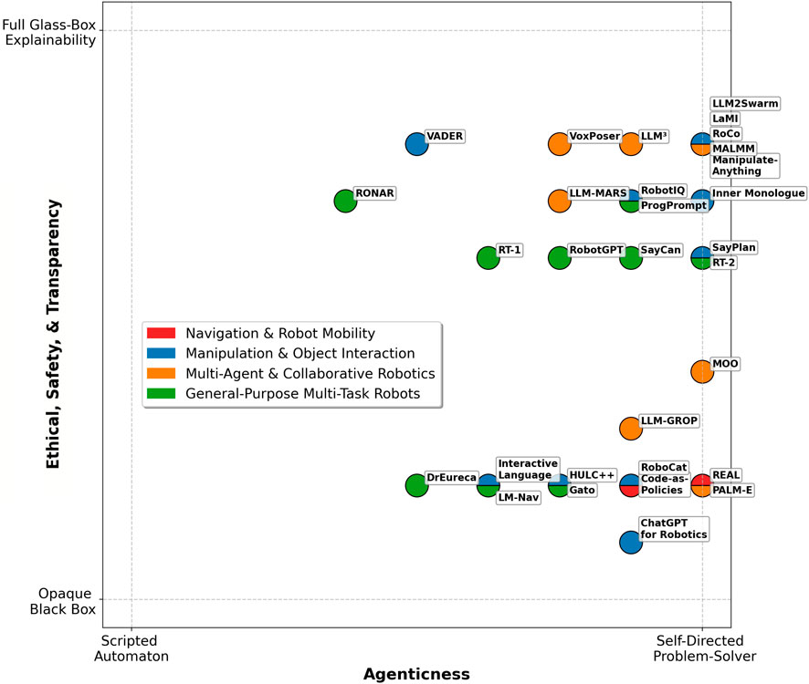 Figure 4. Competitiveness Graph of LLM-based robotic systems, showing their distribution across “Agenticness” (horizontal axis) and “Ethical, Safety, and Transparency” (vertical axis). Approaches are color-coded by their task domain highlighting the trade-offs between emergent autonomy and explainability.