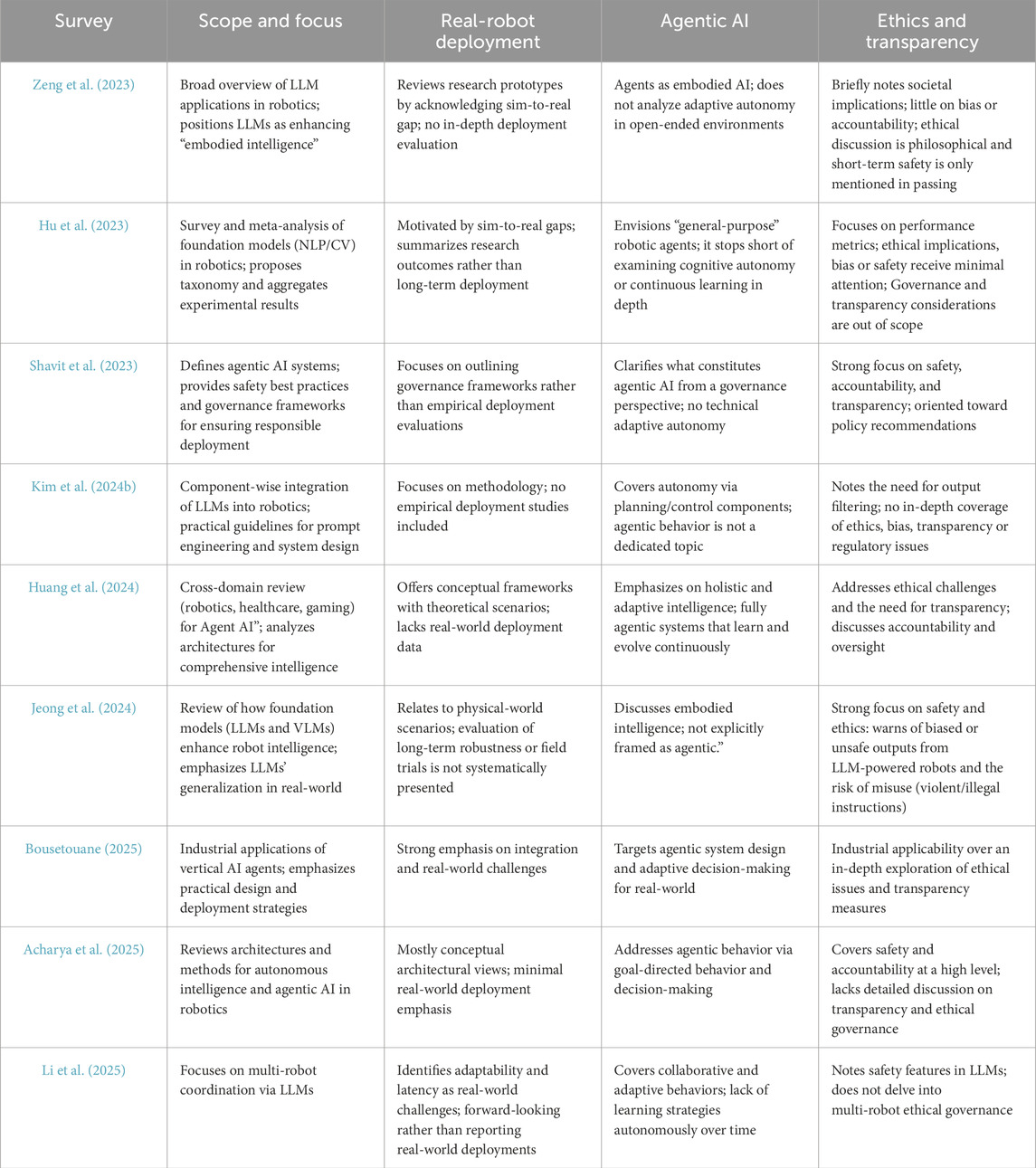 In summary, the current surveys each cover pieces of the LLM-for-robotics puzzle, but none provides a comprehensive picture of LLM-based agentic AI in robotics. Critical aspects such as real-robot deployment, agentic AI capabilities, and depth of ethical, safety, and transparency considerations are not sufficiently discussed as standalone themes. This gap is significant because these aspects will determine whether LLM-based robotic systems can move beyond demos to become reliable, autonomous agents in the real world.