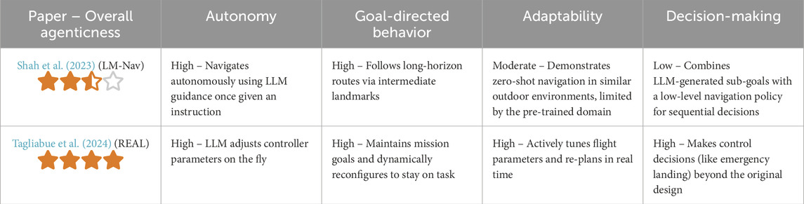 Another shortcoming of prior surveys is their limited treatment of LLM-based robotic systems in real-world deployment. Most of the surveys discuss systems that have only been tested in simulation or controlled lab settings. For example, Zeng et al. (2023) acknowledge that training robotics models purely in games or simulators often fails to translate to real environments–a model with 90% success in simulation might drop to 10% in reality. They cite this sim-to-real gap as a challenge, noting issues like the cost of real-world data collection and the poor transferability of policies trained in virtual settings. However, while they raise the point, the survey does not provide a systematic review of how current research has tried to bridge this gap while remaining an identified problem rather than an analyzed one. Many surveys share this pattern: real-world applicability is acknowledged as a challenge, but not rigorously evaluated. On the other hand, across Table 1, prior surveys lean towards describing architectures and potential applications, with relatively few references to outcomes of real-world experiments. For instance, Jeong et al. (2024) include scattered examples of robotics experiments (such as a mobile manipulator executing plans from natural language, or Google’s RT-2 model for vision-language-action). Yet, the survey still does not compile results from those physical deployments into an analysis of how well current LLM-based robots actually perform when faced with the messiness of reality. Concisely, the prior surveys provide a strong foundation of concepts and initial demonstrations of LLM-based robotic systems, but a survey with a decidedly real-world, deployment-oriented viewpoint is needed to push the field from promising research to impactful practice; which approaches have actually been tested in real robots, what are the outcomes in terms of their agenticness, and what practical recommendations can be made. This new perspective would complement the existing literature by focusing on real-world applicability of LLM-based robotic systems–the very aspect that prior surveys largely left as an open challenge.
