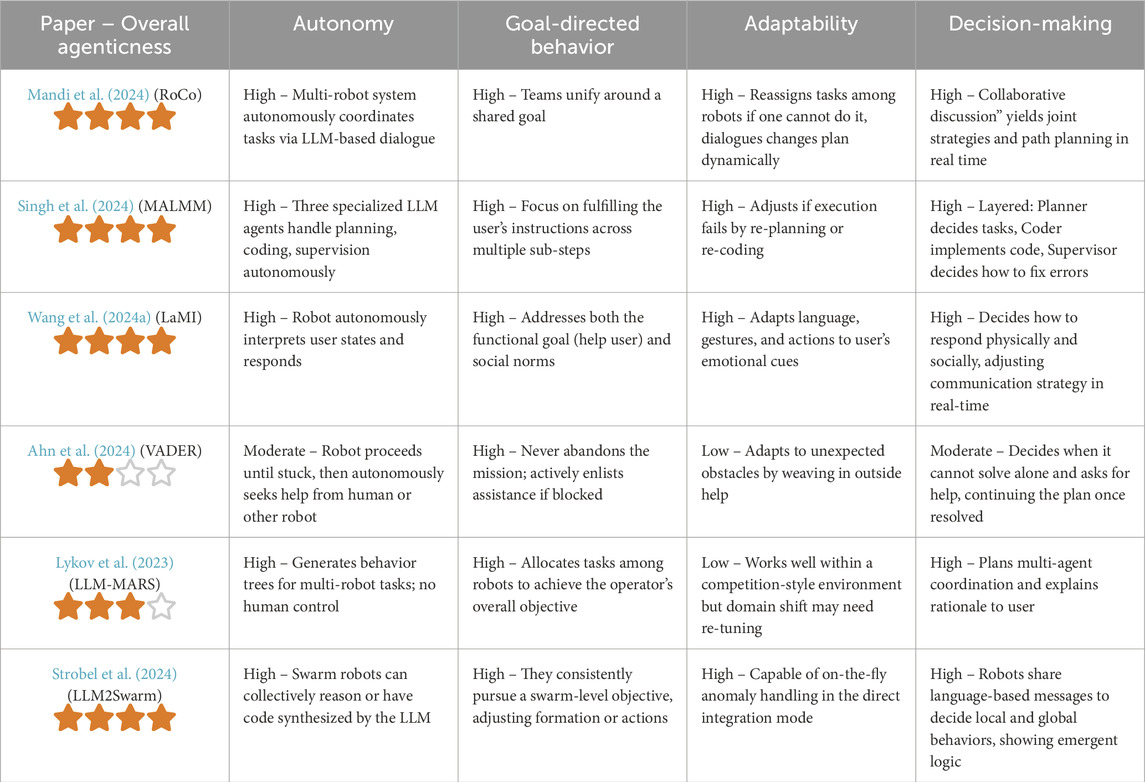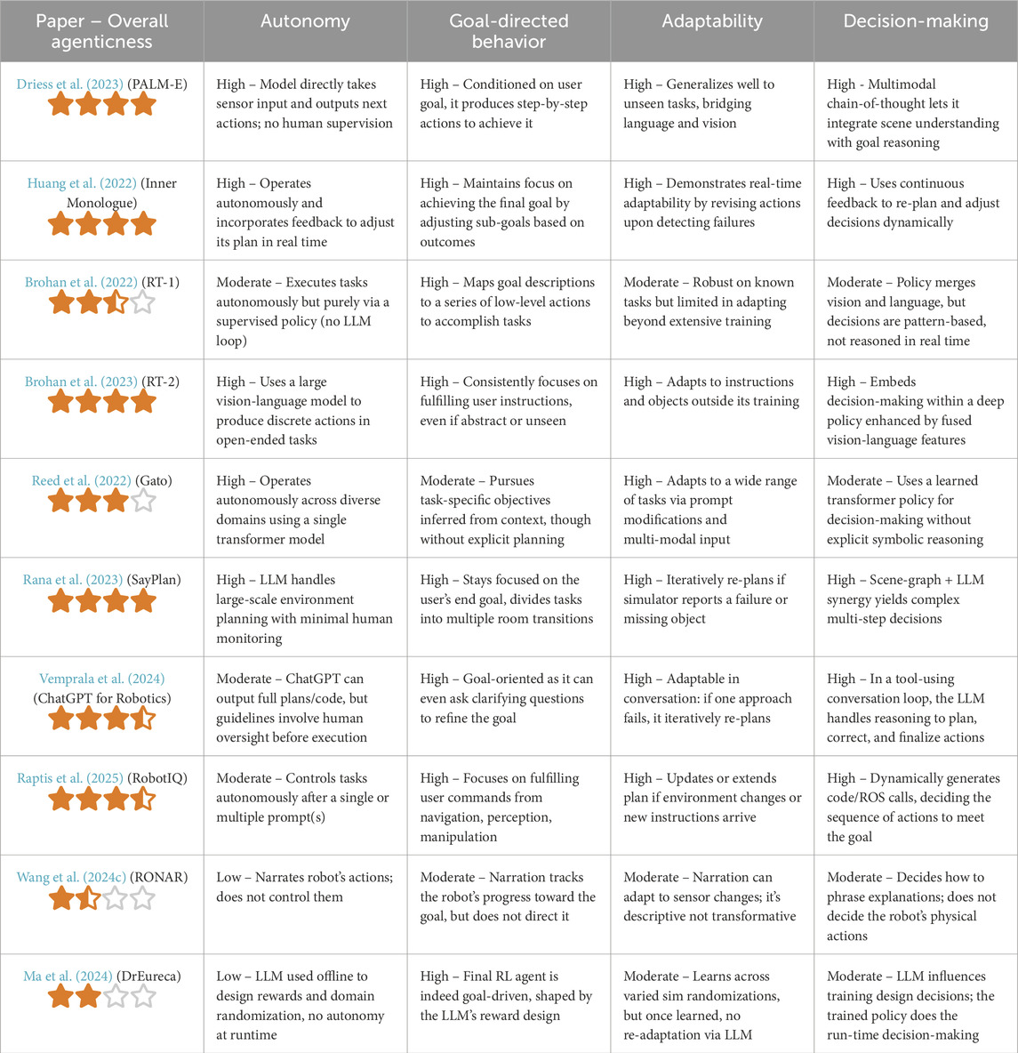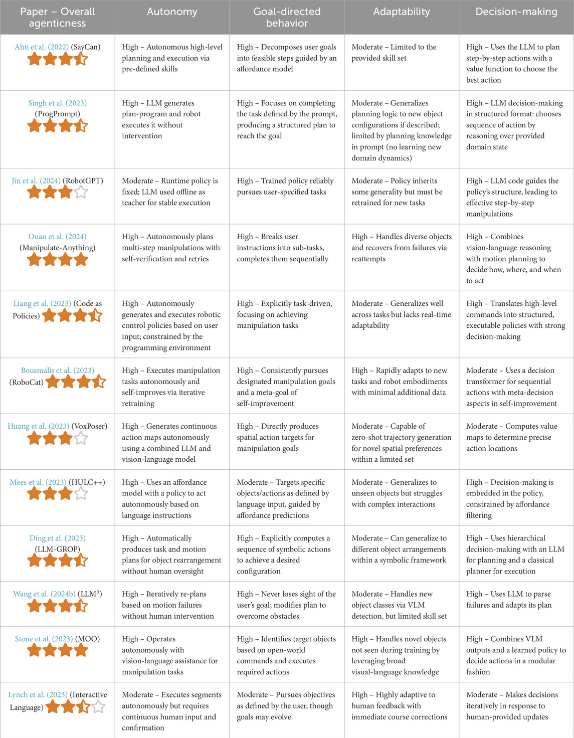 Overall, examining patterns by task domain, we find that different applications emphasize different facets of agenticness. In Navigation and Mobility tasks, LLM-equipped robots tend to excel in Autonomy: once given a destination or instruction, navigation robots can independently chart routes and traverse their environments without step-by-step human guidance. Their Decision-Making requirements, however, are often more constrained–navigating largely involves spatial decisions (choosing paths, avoiding obstacles) which, in many implementations, are assisted by map-based planners or reactive policies. In Manipulation and Object Interaction, systems typically demonstrate very strong Goal-Directed Behavior and notable Adaptability. Each manipulation task has a clear goal (like assembling a part or retrieving a specific item), and the robot must often handle variability in objects and environment. Consequently, these works highlight the LLM’s ability to adapt plans on the fly–for example, a robot arm might figure out how to open an unfamiliar drawer mechanism to find a target object, or adjust its grasp if an object slips, all in service of the specified goal. In Multi-Agent and Collaborative Robotics, the dominant theme is sophisticated Decision-Making through communication and dynamic role allocation. Here, an LLM or a network of LLMs facilitates coordination among multiple robots, often by having agents communicate in natural language to share information and divide responsibilities. This leads to very agentic group behavior: the robots collectively decide who will do which sub-task and when to assist each other, guided by the LLM’s high-level reasoning about the team’s objectives. Finally, the Generalist Multi-Task Robots exhibit the broadest agenticness across all dimensions. These systems, built on powerful foundation models, integrate multiple modalities (vision, language, action) and can perform a wide range of tasks, requiring high Autonomy, goal-driven flexibility, and context-aware decision-making all at once. In the surveyed papers, such generalist robots leverage LLMs to plan and execute across navigation, manipulation, and more within a single unified framework. As a result, they must achieve a balance of skills: strong autonomy to handle open-ended missions, adaptive reasoning to generalize across diverse scenarios, and careful decision-making to select the right tools or actions for each robotic task.