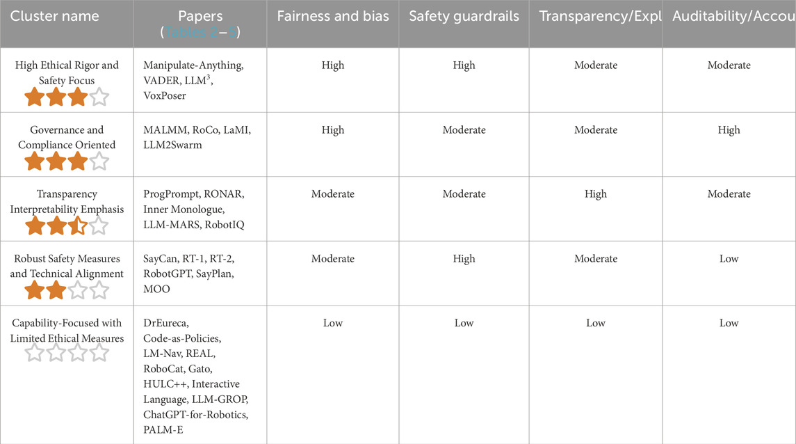 Using the above metrics, we qualitatively assessed the LLM-based robotic systems from Tables 2–5 and grouped them into five clusters. Each cluster contains systems with similar levels of ethical safeguards or shortcomings. Table 6 below summarizes the clusters, listing representative papers and a qualitative rating (High/Moderate/Low) for each of the five metrics. These ratings are based on evidence in the papers (e.g., documented bias tests, explicit safety modules, explainability features) or, when not explicitly stated, our inference from the system’s design and stated capabilities.