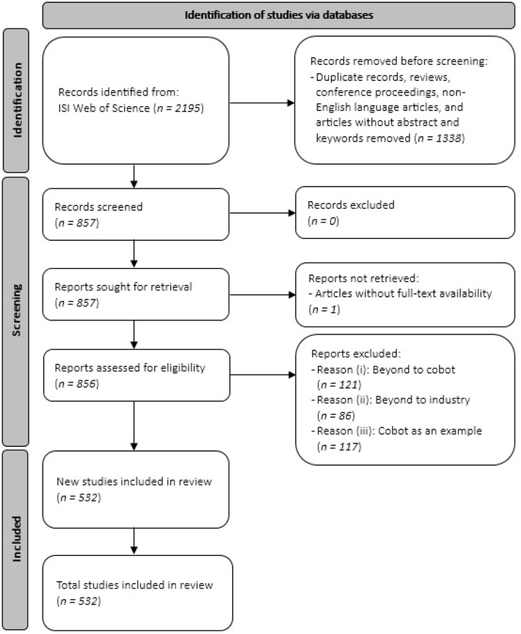 First, a comprehensive search strategy was formulated to access a diverse array of articles for consideration. This search was carried out in the ISI Web of Science (WoS), recognized as one of the premier repositories in research, covering the earliest date available in the database up to, and including, December 2022. The search string used was “collaborative robot*” OR cobot * in either the title, abstract, or author keywords fields. Due to the extensive nature of the research conducted, our objective was to identify as many relevant papers (including journal articles, reviews, and conference proceedings) as possible, focusing solely on cobots, totaling 2,195 records. That two-word search string was chosen after trying broader strategies leading to more records. Those broader strategies, including for example, the additional terms OR “human robot interaction” OR HRI multiplied the number of records by at least 40. However, a significant portion of those records was not related to cobots, as per its meaning presented in Section 1. Indeed, research on human-robot interaction or collaboration is also dealt with in the literature for industrial robots that are not inherently designed to interact with humans or for service robots for example. Adding other keywords made the amount of articles to screen impossible to assess humanly in a timely manner by the research assistants, due to limited staff, as well as time and budget constraints. Because of that, and to minimize the number of papers not related to cobots in an industrial context, the paper focuses only on the two-keyword strategy. Analyzing the papers started in 2023 and finished in 2024. The writing of the paper followed in 2025. Figure 1 illustrates the process of the PRISMA-ScR guideline for selecting the relevant literature and the number of papers handled at each part for the chosen strategy.
