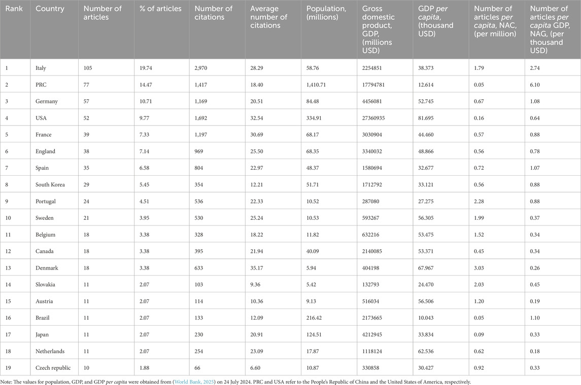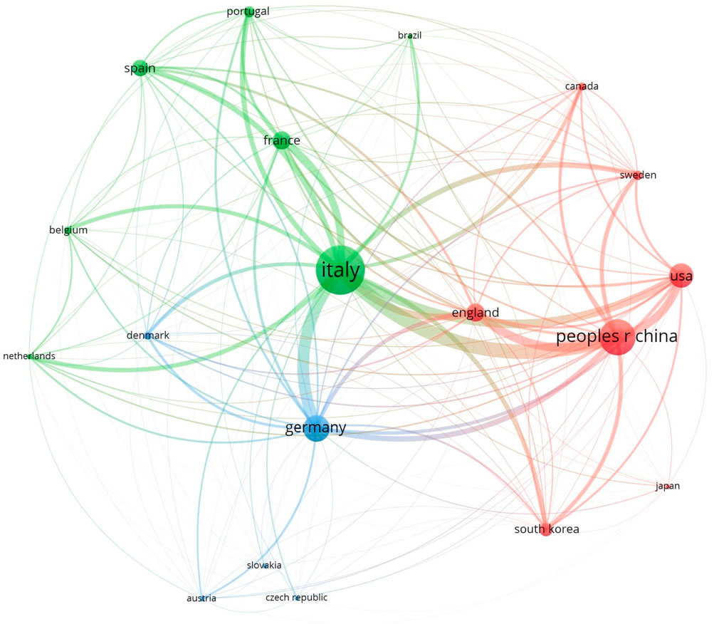 The 532 retrieved papers come from 59 distinct countries (see Table 2; Figure 3). Figure 3 illustrates the bibliographic coupling among these countries. Bibliographic coupling occurs when publications from two countries reference works from a third country. Each country is represented by a sphere, with the size of the sphere and its label indicating the magnitude of the contribution; larger spheres and labels denote greater contributions. The thickness of the arcs connecting spheres represents bibliographic connections while the colors indicate collaboration clusters of countries.