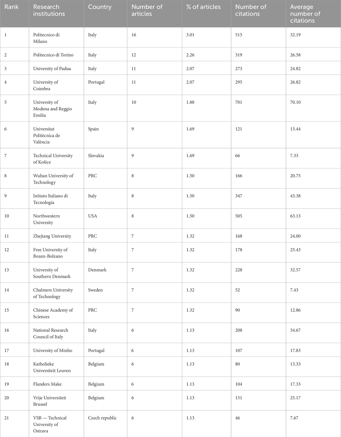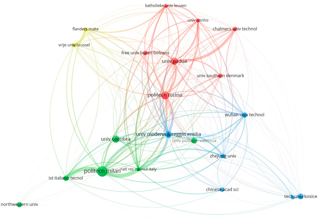 An analysis reveals that 570 research institutions have contributed to the 532 retrieved articles advancing the field of cobotics for industry. Among these, 21 institutions have published six or more papers. As shown in Table 3, the most productive institution in cobot research is the Politecnico di Milano, with 16 publications. This is followed by the Politecnico di Torino with 12 publications, and the University of Padua and the University of Coimbra, each with 11 publications. Among the 21 institutions publishing six or more papers, the University of Modena and Reggio Emilia stands out, having attracted the most attention from scholars based on both the total number of citations and the average number of citations. Notably, 7 of the top 21 institutions are from Italy, highlighting the country’s dominance in this research area. Figure 5 represents the bibliographic coupling among research institutions. Bibliographic coupling occurs when publications from two institutions reference works from a third common institution. Each research institution is represented by a sphere, with the size of the sphere and its label indicating the magnitude of the institution’s contribution. The larger the sphere and label, the greater the contribution. The colors represent clusters of institutions, while the thickness of the arcs between spheres represents the strength of the bibliographic coupling.
