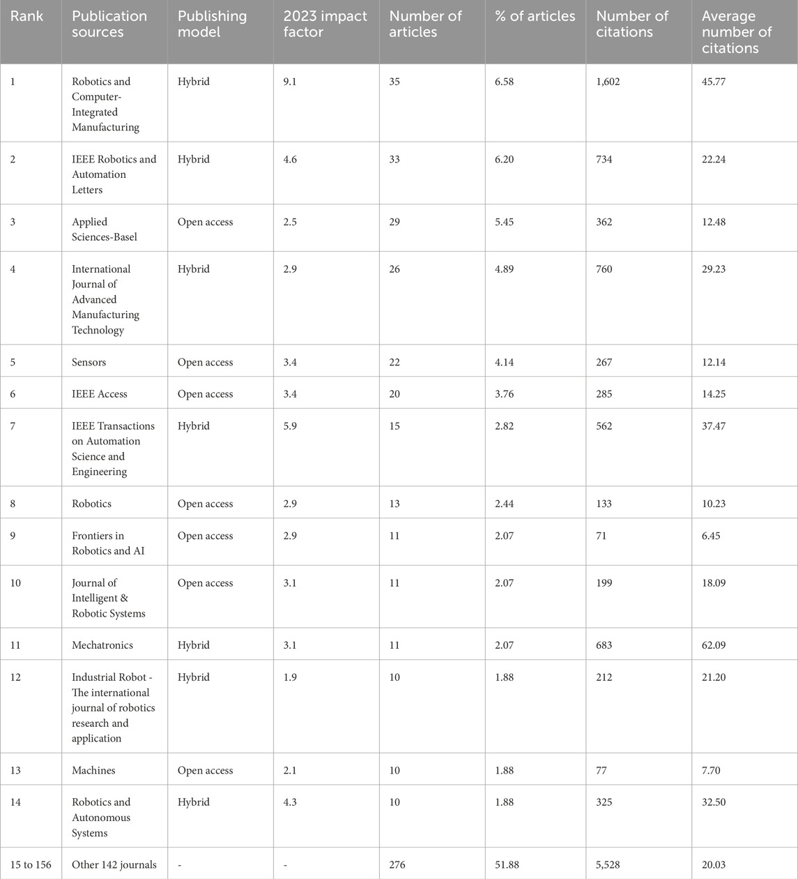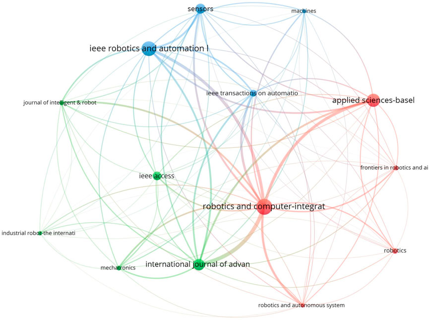 The analysis of publication sources is essential to identify the main journals in a research field, to help researchers find relevant literature and select the right journals for their work. The analysis of 532 selected papers revealed that they came from 156 different journals. Table 4 lists journals that have published more than 10 papers on cobotics for industry. The journal “Robotics and Computer-Integrated Manufacturing” is the leading source, with 35 publications, followed by “IEEE Robotics and Automation Letters” with 33 papers, “Applied Sciences-Basel” with 29 papers, and the “International Journal of Advanced Manufacturing Technology” with 26 papers. Regarding citations, “Robotics and Computer-Integrated Manufacturing” ranks first with 1,602 citations, followed by the “International Journal of Advanced Manufacturing Technology” with 760 citations, and “IEEE Robotics and Automation Letters” with 734 citations. However, papers published in “Mechatronics” attracted the most attention on average, with 62.09 citations per paper, while “Robotics and Computer-Integrated Manufacturing” ranks second with 45.77 average citations. Figure 6 illustrates the bibliographic coupling among various publication sources active in the cobotics with at least 10 papers. The size of each sphere indicates the journal’s relative strength in publishing cobotics papers, the color represents clusters of journals, and the thickness of the arcs between journals indicates the strength of their bibliographic coupling.