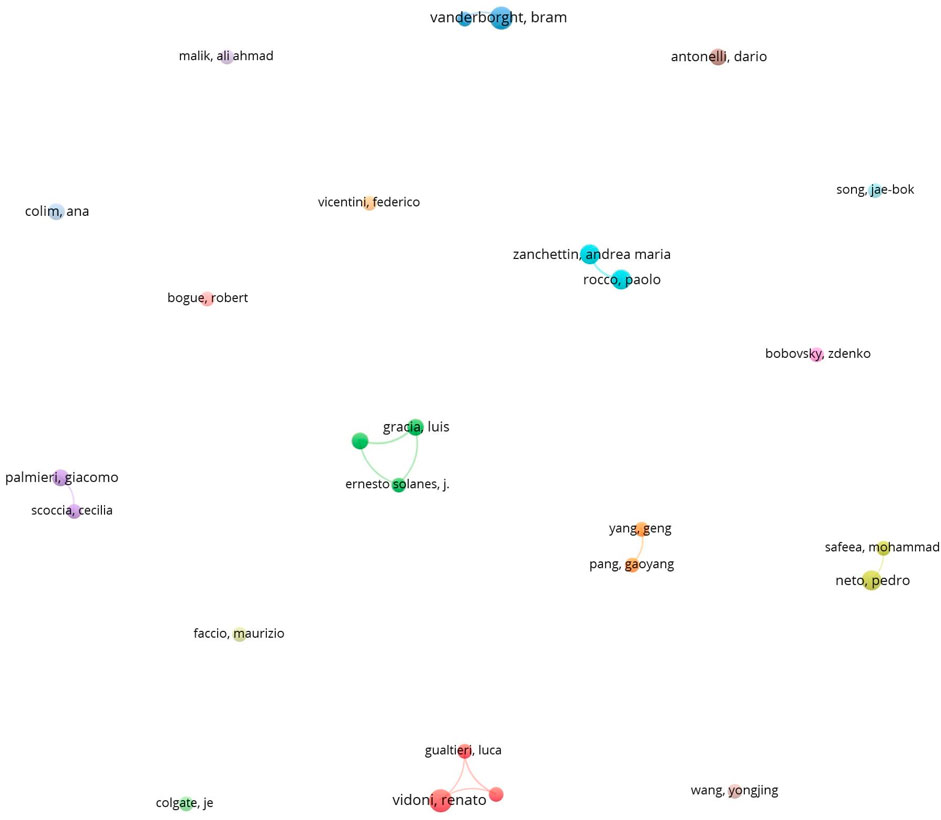 Figure 7 illustrates co-authorship in the cobotics research field for industry, with spheres representing authors, colors indicating clusters of authors, and arcs showing co-authorship strength. It reveals that the international community actively engaged in cobotic research remains limited.
