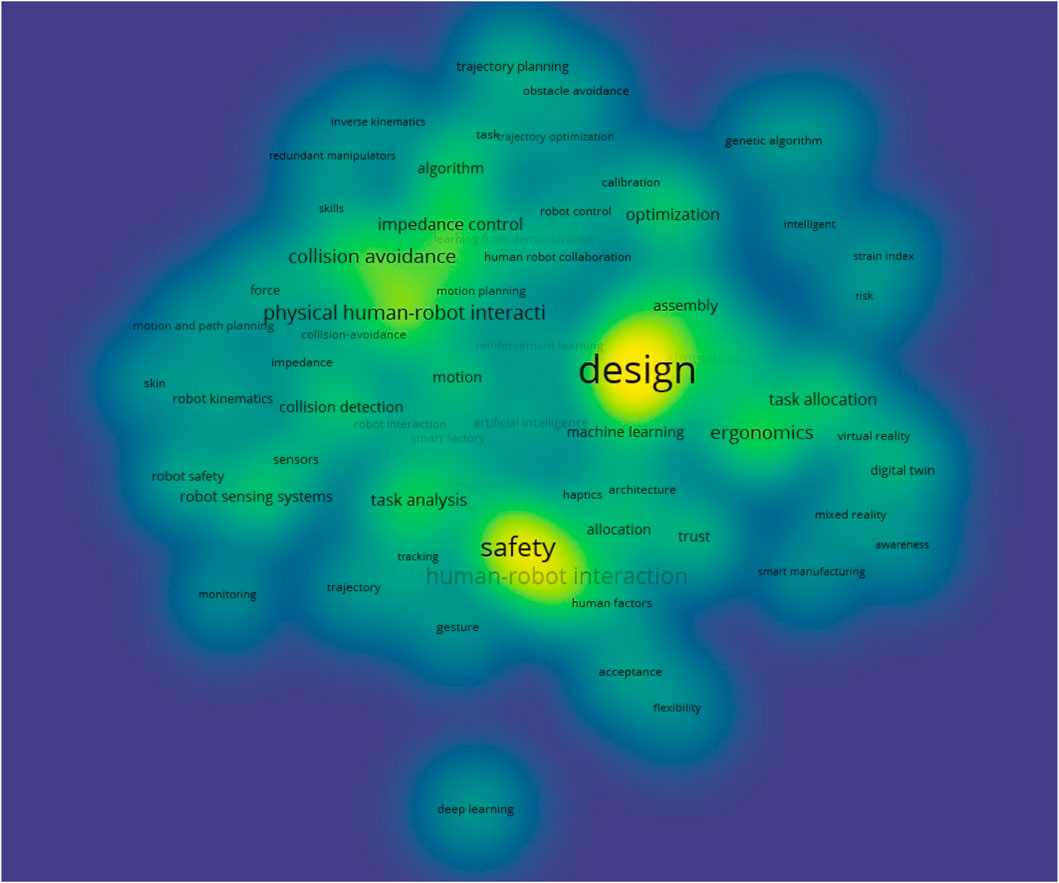 Analyzing the frequency of terms in the 532 retrieved papers offers valuable insights into the main research topics within the field of cobotics for industry. To identify the most prominent topics, a terms co-occurrence density map was constructed. Terms appearing in at least five papers were included, while general terms such as “work”, “model”, or “methodology”, as well as cobot-specific terms like “robot”, “collaboration”, “collaborative robot”, or “cobot”, were excluded. This process identified a total of 71 relevant terms, with their co-occurrence density visualized in Figure 8.