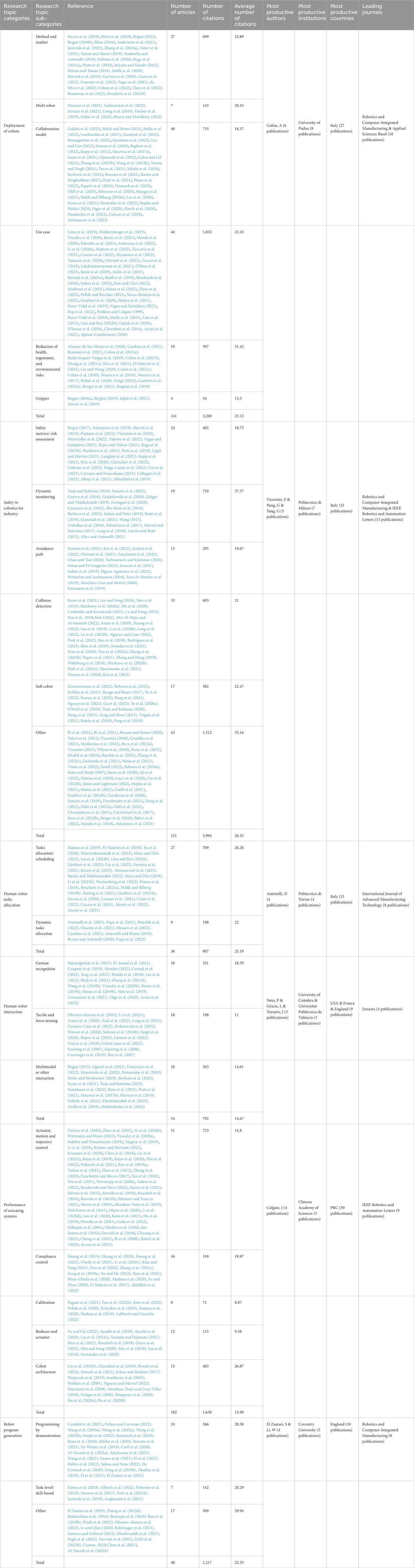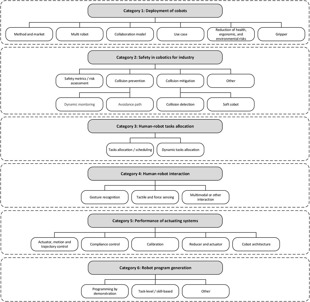 (v) It introduces a clear and consistent univocal categorization framework encompassing six main research topics and 25 subcategories, providing a valuable roadmap for researchers exploring diverse aspects related to cobotics, including safety in collaborative applications, cobot deployment in industrial settings, task optimization between humans and robots, communication between humans and cobots, and cobot actuating systems.