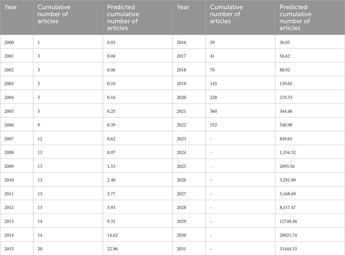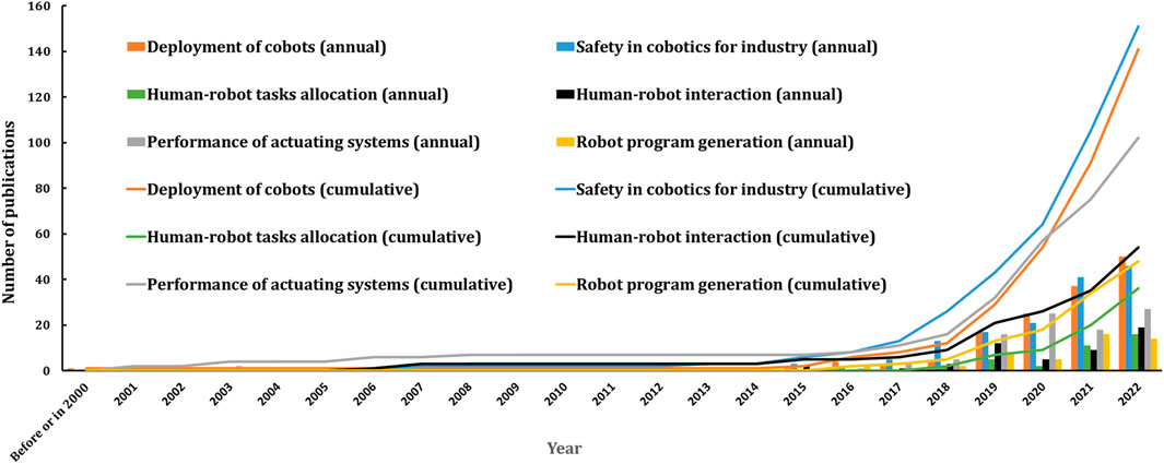 The number of publications is an important indicator for measuring the development trends within a research domain. By analyzing the number of publications over time, one can easily infer research activity levels and trends, which in turn allows for the estimation of future activity levels (Yang et al., 2019). Figure 2 presents the annual and cumulative number of publications focused on the topic of cobotics for industry. It shows that there were only 14 publications before or in 2015. This period can be considered the initial stage, where little research explicitly focused on cobot in industrial settings. Since 2016, the number of publications in this field has increased significantly. Furthermore, the cumulative number of publications approximately follows an exponential growth pattern, as calculated by Equation 1: